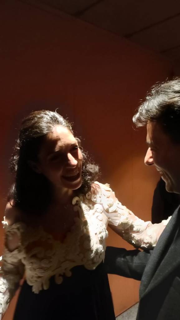 The second of Liszt’s Paganini Studies was played with such scintillating teasing charm that the thought of a study just did not cross our mind. A charm and beguiling sense of style that brought a smile to our face until of course the central episode where octaves were unleashed with an exhilarating dynamic force and energy that I almost feared for the life of this 1890 Bechstein.It was short lived because the return of the embellishments were played with even more exquisite delicacy and a charm where music could speak much louder than any words.. Prokofiev brought us an even more startling palette of sounds where Nikita’s fearless drive was contrasted with moments of radiance and unsettling peace. The end of the first movement, after war like sounds over the entire keyboard, was allowed to rest with the unsettling sound of a beacon that pierced the seemingly exhausted air with menacing rumblings in the distance. Nikita brought a whispered beauty to the mellifluous ‘Andante caloroso’ where he drew us in to listen to such marvels as lights were allowed to glow over the entire keyboard with washes of sound, notes just disappeared as they were incorporated into a poetic vision of poignant beauty. The last movement is a ‘tour de force’ for any pianist and Nikita rose to the challenge with total mastery. The whispered ‘precipitato’ was a relentless rhythmic undercurrent on which Prokofiev shoots off missiles in all directions. Gradually building in tension as more and more notes are added without any slowing of the relentless forward drive. Overwhelming excitement and exhilaration of Nikita’s performance tonight was a truly harrowing experience from this poet of the keyboard. Twenty five candles could not be accommodated on this sumptuous cheesecake Nikita with Julia celebrating in Florence after the concert