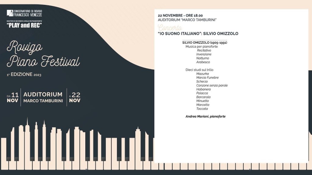 Silvio Omizzolo, born in Padua from a family whose roots were in the Asiago plateau, in the pre-Alps near Vicenza, was an excellent pianist and piano teacher, director of the Istituto Musicale C.Pollini, Padova, but also one of the main composers in the region of Venice during the XX century. A student of the composer Almerigo Girotto, from Vicenza, Omizzolo tempered his love for the romantic tradition in a constructivist language, largely based on counterpoint, which may be compared to those of Paul Hindemith and Bela Bartok; he also experimented with dodecaphonic techniques. His major works for the piano are Dieci Studi sul Trillo (1936-39), which have been recently arranged by the famous jazz player Enrico Intra and the jazz septet of Marco Gotti (Lectio brevis sul trillo per pianoforte di Silvio Omizzolo, 2005); another important work is the Concerto per pianoforte ed orchestra (1959-60), which received the 3rd prize from the Queen Elizabeth International Music Competition , Bruxelles 1969.