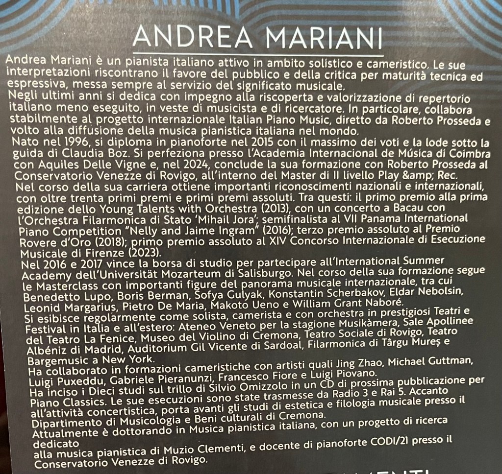 All this to present Andrea who is coming to the end of his studies in Rovigo under the eagle eye of Roberto Prosseda, preparing a doctorate on the piano music of Muzio Clementi ! The young musician who I had heard playing to Paolo Fazioli in Cremona is now an artist of quite considerable authority. A pianist who plays with weight and with his beautiful arched hand can dig deep into every key and find sounds that others search for in vain. A programme that gave me a chance to listen to more of the studies of Silvio Ormizzolo contrasted with works by the most important of all pianistic innovators Fréderick Chopin.