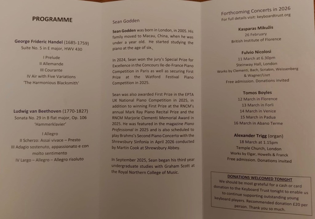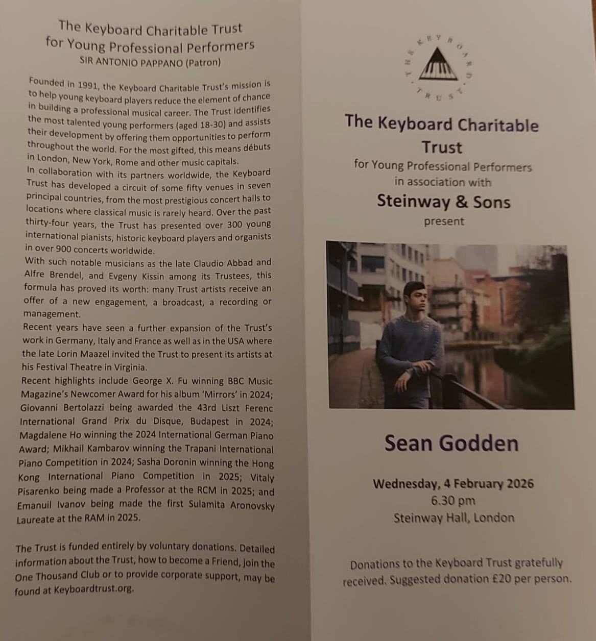 Steinway Hall in London opened its doors and piano lid for the Keyboard Trust New Artist recital once again. It was a newly fledged model D, plastic films still protecting the pedals, its grandeur ready to be discovered. Discovered it was, by a 20-year-old Sean Godden, 3rd year student at the Royal Northern College of Music studying with Graham Scott. The opening chords of Handel’s 5th Suite transported the audience into a large cathedral, filled with glorious lines, whispering and grand columns of harmony in the improvisatory Prelude. Creating a rich ambience with his pedalling, Sean flowed smoothly through the conversations between the voices in the Allemande, timing the pace with flexibility and poise. The sharply articulated Courante was full of surprises, creating a boisterous contrast. The famous ‘Harmonious Blacksmith’ followed as the final movement of the Suite. Best known as a separately performed piece that is rumoured to have been inspired by a blacksmith’s hammer striking the anvil with a repeated note – B, as was witnessed by Handel who had sheltered in a smithy from rain. Whatever the origin, this famous piece does not fail to excite with its progressively faster notes, starting with crotchets and quavers, then semi-quavers, then triplets and semi-demi-quavers. Sean took a brisk tempo at the start and did not budge when it came to the pages blackened with notes – it was an exciting rendition! A little less pedal and more finger articulation to accentuate the start of each note, a little like the harpsichord, would add extra fire to the otherwise stellar performance.