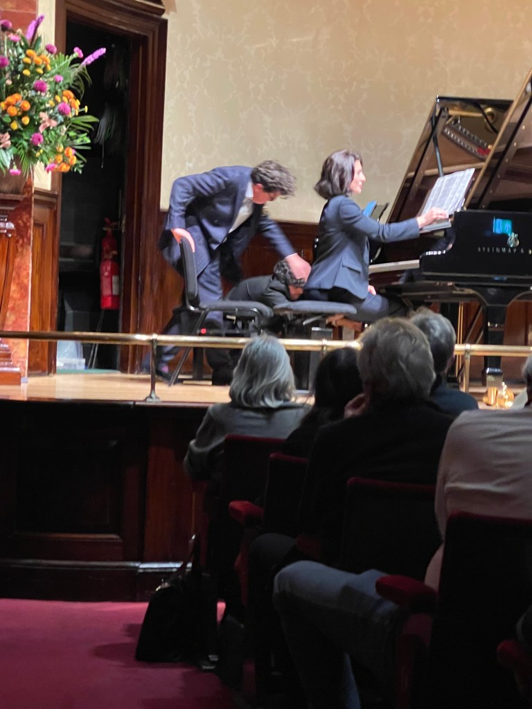 Prokofiev’s Sixth Sonata was the main work on the programme and she unleashed it on us with fearless abandon and breathtaking dynamic drive. Prokofiev’s demonic insistence played out with extraordinary virtuosity and architectural understanding. A burning cauldron of sounds to which the shrieks of pain and anguish would be nailed with merciless brutality. Beatrice had seen the vision that this sonata depicts of the brutality and suffering that conflict can bring as she described it in sounds with breathtaking mastery. The seemingly innocent trot of the ‘Allegretto’ was short lived as all sorts of surprises are imposed on it with beguiling insinuation. A ‘tempo di valzer,lentissimo’, was a languid outpouring of beauty and an oasis of beauty on this field of combat but soon built in passionate intensity as Prokofiev tries to find a reason for such cruelty. There was real menace to the ‘Vivace’ last movement that Beatrice played with fearless abandon and frenzy. A real boiling pot of sounds out of which Prokofiev places his leit motif with devastating effect. This was truly a masterly performance and an amazing ‘tour de force’ especially as Beatrice was not alone at the keyboard this time!