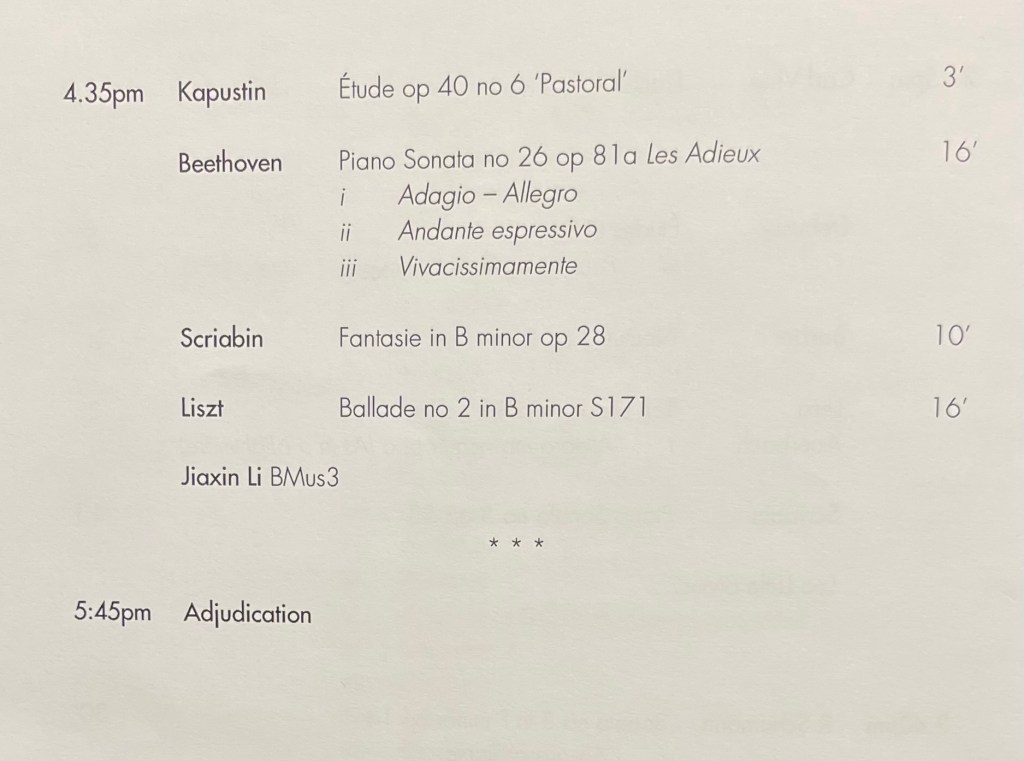 The ‘Scherzo’ just flew from her hands but with measured control and with considerable technical command. Even the ‘Trio’ she managed to maintain a similar tempo that made the surprise return to the ‘Scherzo’ even more effective. The ‘Intermezzo’,introduction to the last movement, was played with radiance until the menacing left hand throbbing of a desolate heart was intoned with extraordinary mastery and anguish.The ‘Finale’ that can sound so fragmented in lesser hands was played with such rhythmic finesse that the pieces fitted together in a jigsaw puzzle of genial invention. It was in the coda that Khystyna lapsed into sixth gear again and lost the grandeur and timeless magnificence of the climax of this monumental work. It was an amazing ‘tour de force’ where after the ‘più mosso’ she could even play faster the ‘Presto’ with extraordinary fingerfertigkeit, but it was where her technical prowess took over from what was truly in the heart and soul of a great pianist in the making .