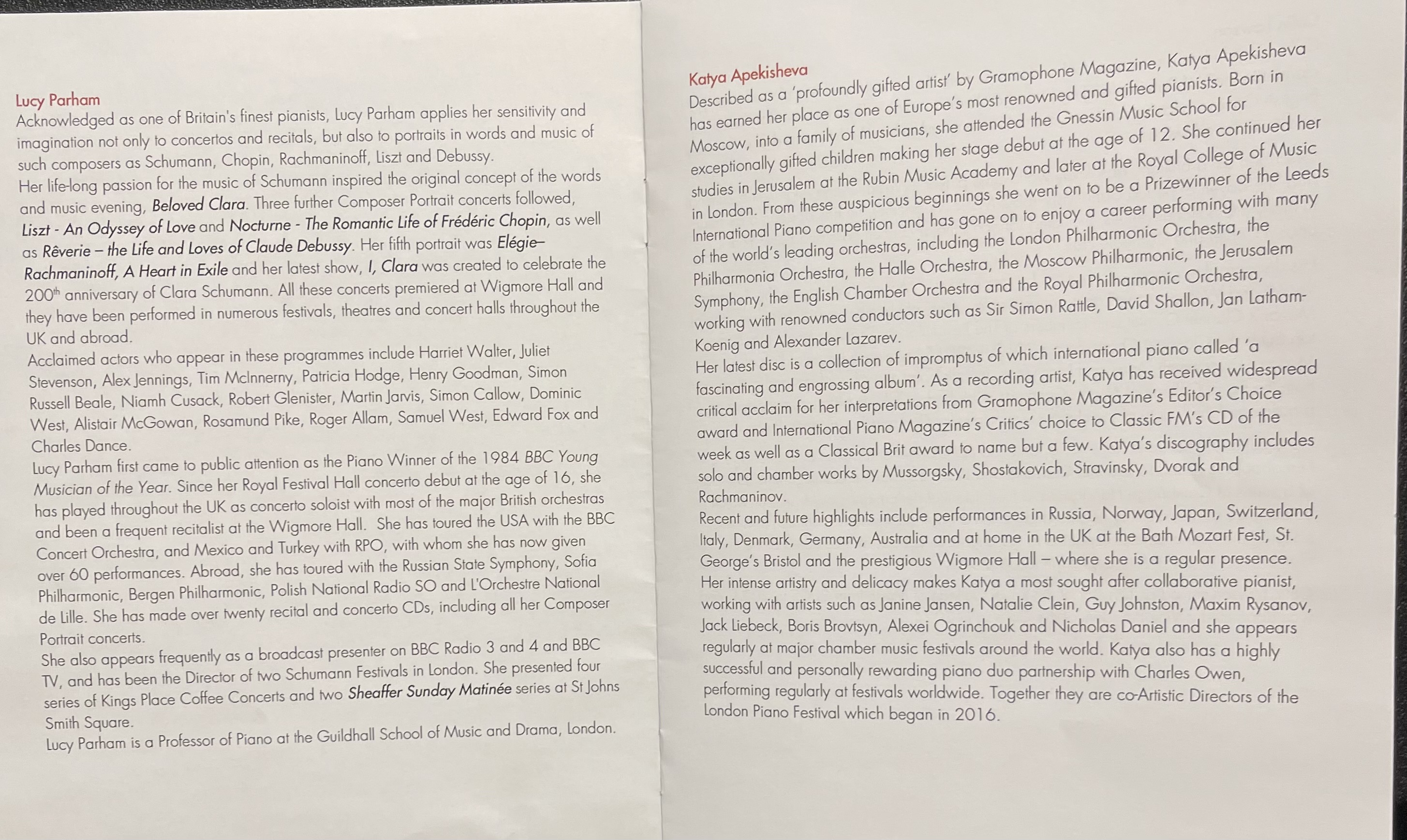 Calm after such a storm and torrent of notes with the ‘Berceuse’ from Fauré’s Dolly Suite. Mariam at the top with beauty and seamless delicacy restored by two pianists who could play with the whispered beauty of glowing radiance that had held a full Wigmore Hall enchanted and enthralled, happy to be present at the birth of such a distinguished duo.