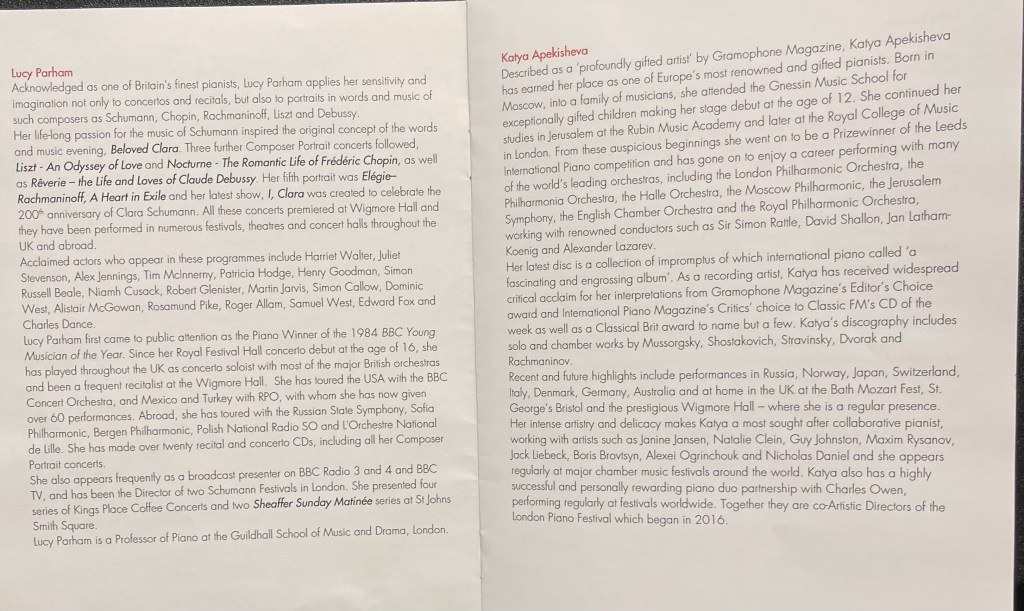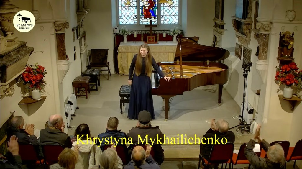 This is the third time I have heard Khrystyna since she was forced to flee her homeland and find refuge in the UK. It was Dr Mather who was one of the first to come to her rescue as she found a way of continuing her artistic journey in a new country. Like Chopin who fled his homeland, the heritage it had left him was always present in everything he did whether in Vienna ,Paris ,Nohant or even Majorca. Khrystyna too has inherited a musical training that has given her a phenomenal technical command of the keyboard but also a love for the sound of the piano. Her ‘fingerfertigkeit’ was given to her as her hands were growing as a child and they were obviously formed with a flexibility and natural beauty that can only be acquired from this early age. Whatever she plays there is always a wonderful fluidity and beauty of sound. Never hard or ungrateful sounds of tension but music that flows from her fingers as it did for Alicia De Larrocha ,Argerich and Pires too. Khrystyna is also blessed with a temperament that can excite as it can seduce.