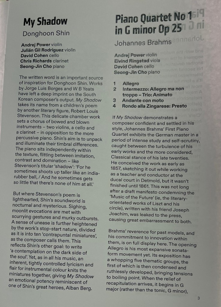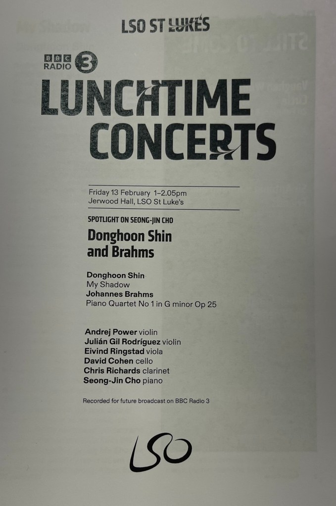 The magical sounds of Donghoon Shin with only four of the players from last night sharing the intimate stage of St Luke’s. A performance where notes shone like jewels in the dark as Cho played the part of Stevenson’s shadow :”For he sometimes shoots up taller like an India- rubber ball , And he sometimes gets so little that there’s none of him at all.