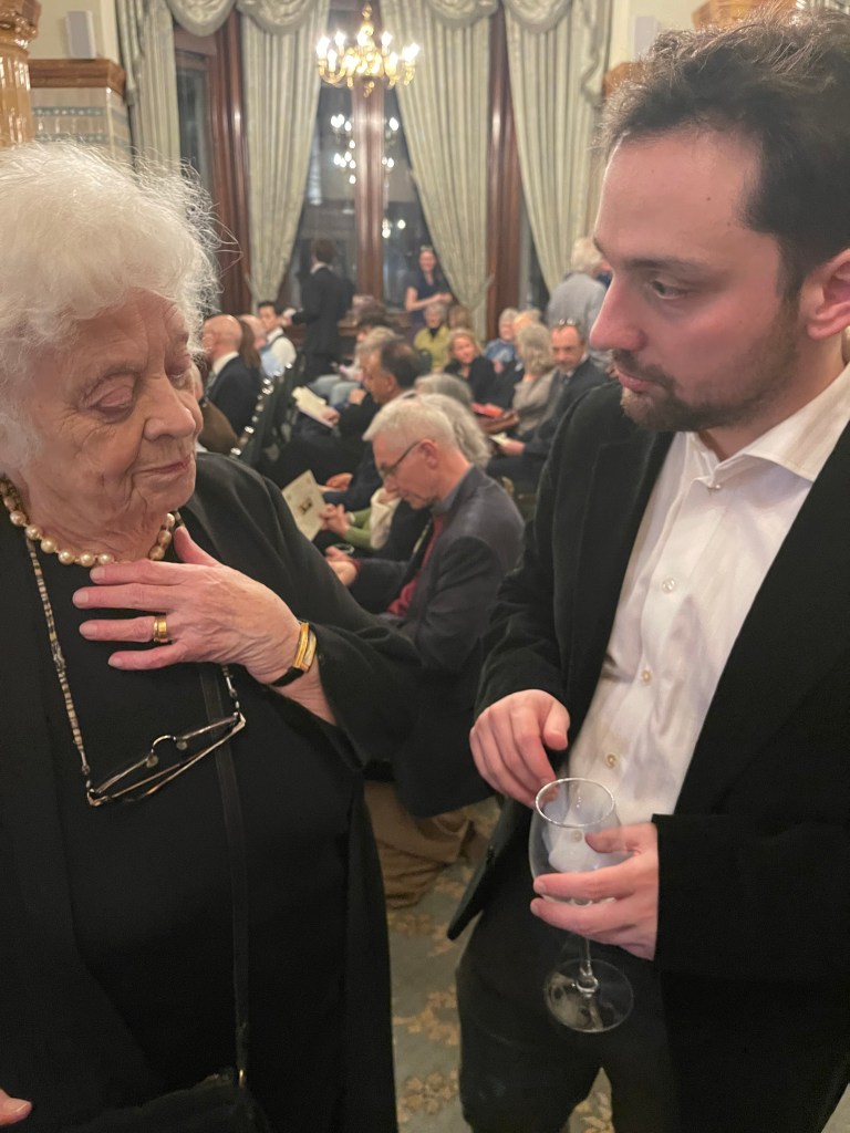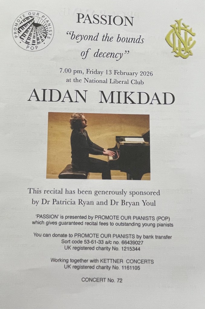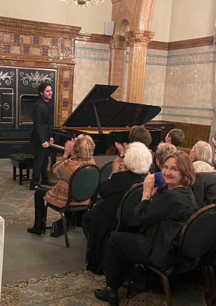 Aidan Mikdad looked bewildered and dazed as the magic spell he had unknowingly created was broken by the ovation he received at the National Liberal Club last night for Mary Orr’s inaugural ‘Promote Our Pianists’ concert series. I missed his ‘Waldstein’ Sonata that he confided was his first performance of this work that Delius was to describe as all scales and arpeggios. Aidan spontaneously modest as he came down the sumptuous staircase on his way to the green room and saw me just arriving in time for his Chopin . Mary Orr knew I had been invited by the LSO to the spotlight on Seong- Jin Cho