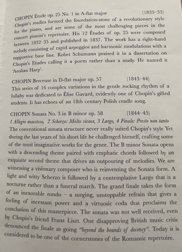 The sun magically shone onto the keyboard at this very moment of enlightenment. Even the sforzando at the beginning of the coda was played only by the bass and not the usual thumb of the right hand and lead to an outpouring a phenomenal playing where poetry and technical mastery were combined to the glory of the genius of Chopin.