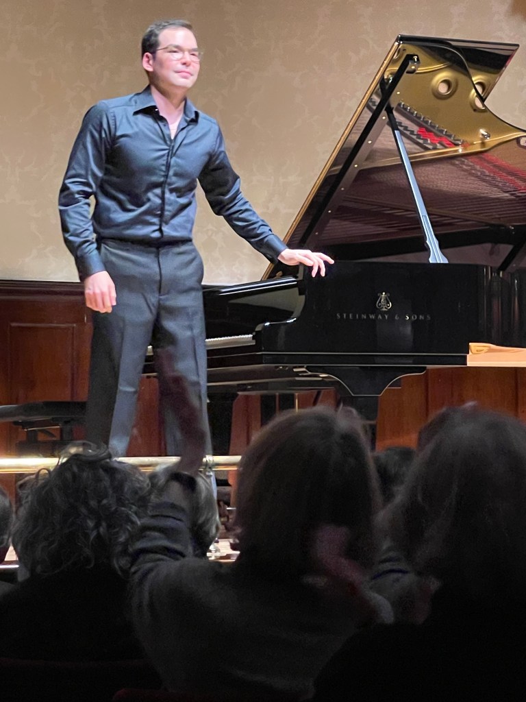 The Liszt Sonata was for me the main work on the programme today and it was given a place of it’s own as the only work in the second half. A monumental performance from a thinking musician who could give an architectural shape to a work that is really one long arch starting and finishing with the same whispered motif. Transformed in three continuous movements into moments of extreme delicacy, searing passion and fearless abandon. The whispered opening, like Alim’s ‘Appassionata’ was where the rests became as important as the notes, before bursting into flames of passionate declamations. This is just the opening where Liszt introduces us to the three main themes that he will transform into a work of extraordinary originality. If I felt many of Alim’s tempi in the more tempestuous moments rather too fast, it is obviously because Liszt does mark them in two not four. Alim fearlessly playing octaves with passionate outpourings of mastery and sumptuous rich sounds. There were menacing sounds too ,as with his ‘Appassionata’, where Liszt’s devilish rhythmic pulsating motif leads into the beautiful outpouring of ravishing beauty of the ‘Margherita’ theme. After breathtaking pyrotechnics of brilliance and scintillating streams of notes we came to sudden declamatory chords that Alim played with great power, again it was the rests that became of such importance. Alim is a master of balance and colour and it was this that he brought to the subtle beauty of the ‘Andante sostenuto’ and the passionate outpouring whose ultimate climax is the real centre of this mighty work. The ‘fugato’ that follows I really found too fast, but marvelled at the control and resilience that Alim could achieve and it did pave the way for the great bass entry which was every bit as powerful as I remember from Gilels’s magisterial performance many years ago. Alim is a thinking musician and there are no half measures once decided that this tempo in two was the way forward and what Liszt had intended. I think as he lives with this work longer he will find more nobility in these faster passages , maybe even as his youthful mastery makes way for a weightier way forward, like Arrau who was after all a direct descendent of Liszt via Martin Krause. There was a stillness and mastery of control that Alim brought to the final pages where Liszt had struggled with this ending crossing out his original blast and distilling these final two pages that are amongst the most remarkable in all music. A masterly performance of a thinking musican who can add another notable interpretation to the list of great works that he is revealing to his numerous and very appreciative audiences.
