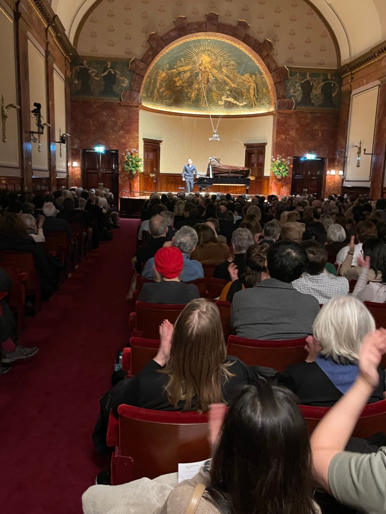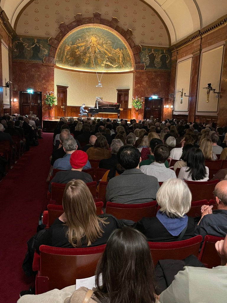 Alim gave the same seemingly improvised freedom to the ‘Moments’ that I so remember from Gilels. Every note had a meaning and colour with Alim’s extraordinary concentration never demonstratively showing us what was in his poetic soul as that was revealed only to those that have the ears and the same concentration to follow the wondrous story that he is sharing. There was a radiance and beauty in the first with the return of the opening like seeing a friend after a long voyage from a magical journey through gasping accompaniments to mysteriously vibrant chords played with timeless beauty and aristocratic style. The second was played with a deep inner sadness of poignant beauty with even a dramatic cry played with extraordinary potency dissolving into playing of exquisite rarified beauty on a cloud of E flat that chimed with beguiling insistence. The third Moment, so memorable in the hands of Curzon, and where Alim today found the same teasing sense of dance of exquisite delicacy and buoyancy. ‘Perdendosi’ Schubert writes at the end that like a dream is probably continuing in the far distance unable to stop such incessant charm and grace. There was a whispered entry to what looks like knotty twine on the page in the fourth , but that Alim played with a fantasy of chameleonic harmonies that had a perpetuum mobile drive with a kaleidoscopic palette of colour and delicacy as a sudden ray of sunlight ignites with radiance the central ländler before continuing on it’s meandering journey . A genial coda where the two worlds are joined with whispered uncertainty played with poetic mastery by Alim . A driving buoyancy to the F minor Moment with an extraordinary echo effect of masterly control as this frenzied dance seemed to fall apart only to be put together again like Humpty Dumpty. Purity and simplicity of one of the most beautiful of Schubert’s creations followed with the sixth and final Moment , and was where Alim’s palette of sounds and wondrous sense of balance could make the piano sing as never before. There was a velvet whispered richness to the Trio contrasting with the return of the opening creating an atmosphere in the hall where we were united in aching moments of silence that were indeed golden.