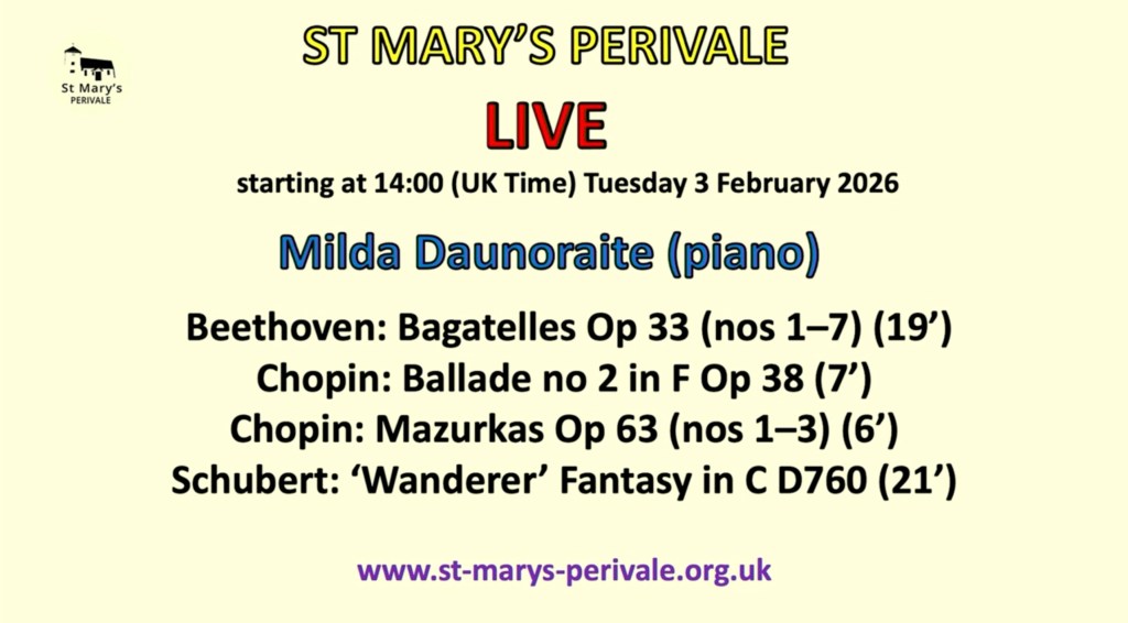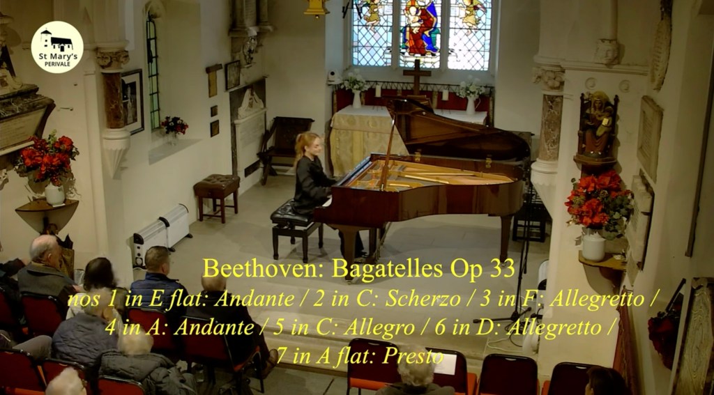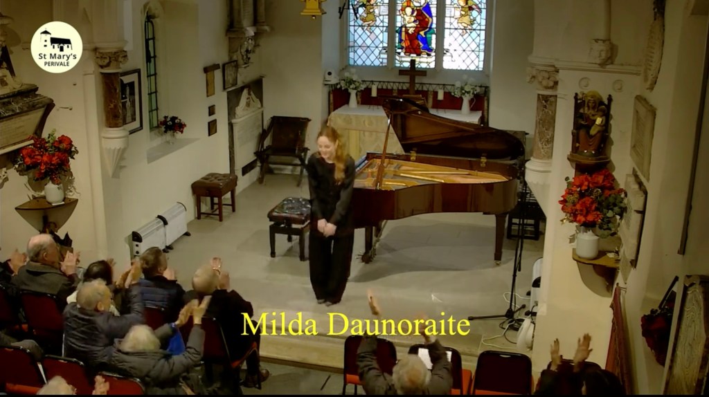 I have since heard her at the National Liberal Club series for the KT and even went on tour with her to Italy. In Florence she not only captivated the elite audience in the Harold Acton Library but she even captivated some Lithuanian waiters in a restaurant the next day with whom she was happy to share her music in return for a free lunch, a red rose……..and a glass of Limoncello she mischievously added later! With Milda you get what you see! Music is so much part of her that her music making takes on a radiant sense of discovery and ebullient joy with the beauty and eloquence that pours from her fingers with music speaking even louder than words. It is thanks to her teacher Tessa Nicholson who over the past years has given her a technical mastery which you could well describe as ‘canons covered in flowers’.