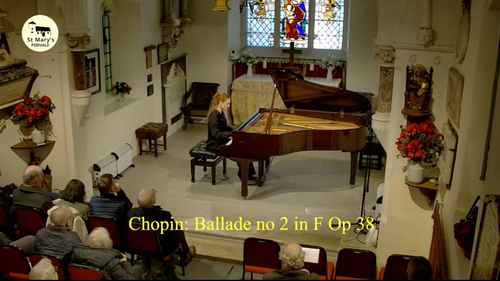 The Chopin Ballade with its opening tolling bell was embraced by a deeply felt melancholy with a forward movement of uplifting vibrancy. Carrying us forward like a barcarolle, before the turbulent interruptions of passionate intensity. Milda’s playing has a way of opening a window on a fantasy world that is created by the immediacy and conviction of her artistic vision. Swirling sounds wafted over the keyboard with a technical mastery that was never ostentatious but became part of the story that she was sharing with us. Outbursts that were short lived as Chopin seems lost and searching for a way forward before arriving at the tolling bells, this time of trills announcing the agitation of the coda. Fearlessly played by Milda throwing caution to the wind as her driving conviction swept away all before her. The opening ‘berceuse’ now timidly showing its face growing out of the vibrations left from such turbulence. It was played or rather whispered, showing a masterly control of the pedal as she brought this story to the end that was in the gasping silence that followed the final short chord.