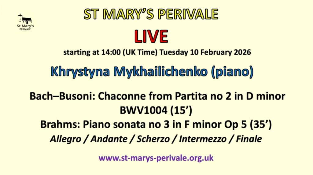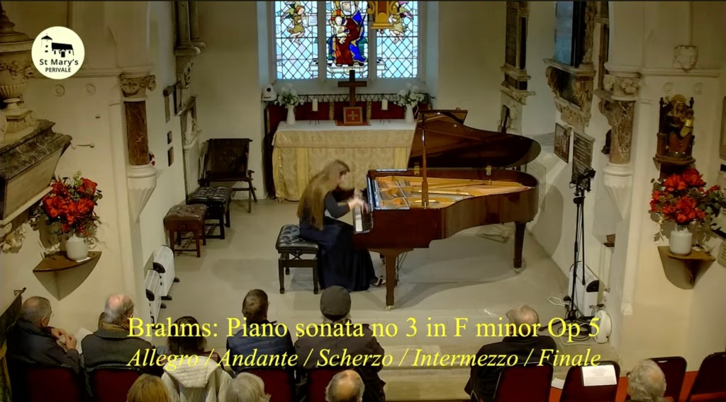 The Brahms F minor Sonata is a monumental work and a real trial of musicianship and resilience . Five movements for what was described by Schumann as a ‘veiled symphony’. Khrystyna played it with the same fearless drive that she had brought to the Chaconne but here it was allied to an architectural understanding that could construct a great Gothic Cathedral of monumental proportions. The fearless rhythmic drive and enviable precision of the treacherous octave leaps was allied to the beauty and simplicity that she brought to the lyrical passages. There were slight fluctuations of tempo but within the framework of the whole sonata . There was a beauty of balance in the ‘quasi ‘cello’ outpouring that Brahms marks with such indications as ‘pianissimo’ and ‘sostenuto’ before the dramatic outburst of the opening fanfare. A grandiose ending to the first movement was contrasted with the glowing luminosity of the ‘Andante espressivo’ and I doubt the ‘Poco più lento Äusserst leise un zart’ has ever been played with such touching radiance and beauty. Maybe only by Curzon ! The central passionate outpouring gave Khrystyna a chance to pour her heart out with passionate intensity and poignant meaning.The ‘Andante molto coda ‘ was played with whispered beauty and aristocratic authority as it built imperceptibly to the fortissimo climax of liberation and exhilarance.