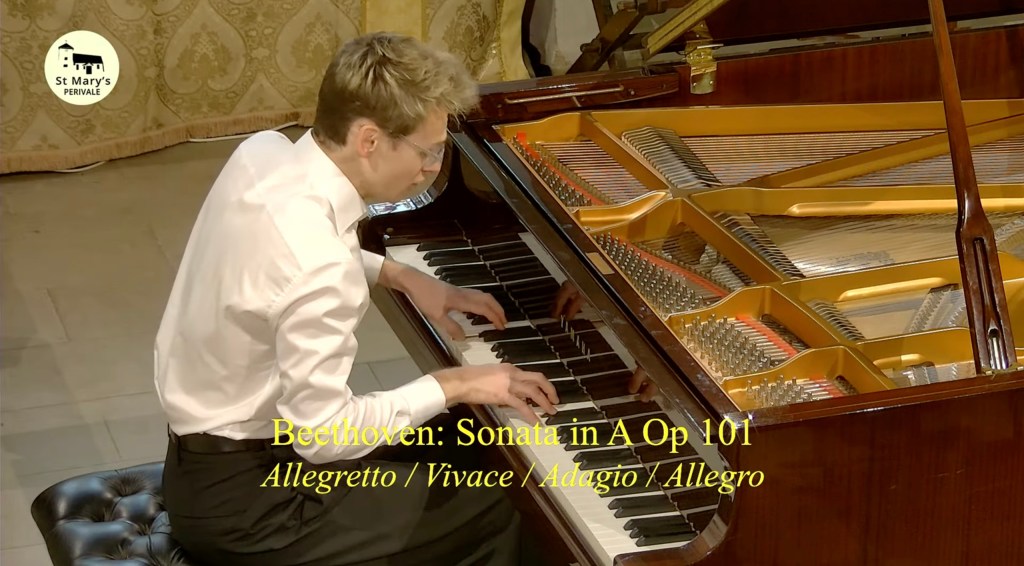 The Piano Sonata No. 28 in A major,op 101, by Beethoven was composed in 1816 and published in 1817 and dedicated to the pianist Baroness Dorothea Ertmann,née Graumen , it is considered the first of the composer’s late piano sonatasl and marks the beginning of what is generally regarded as Beethoven’s final period, where the forms are more complex, ideas more wide-ranging, textures more polyphonic, and the treatment of the themes and motifs even more sophisticated than before. Op. 101 well exemplified this new style, and Beethoven exploits the newly expanded keyboard compass of the day.