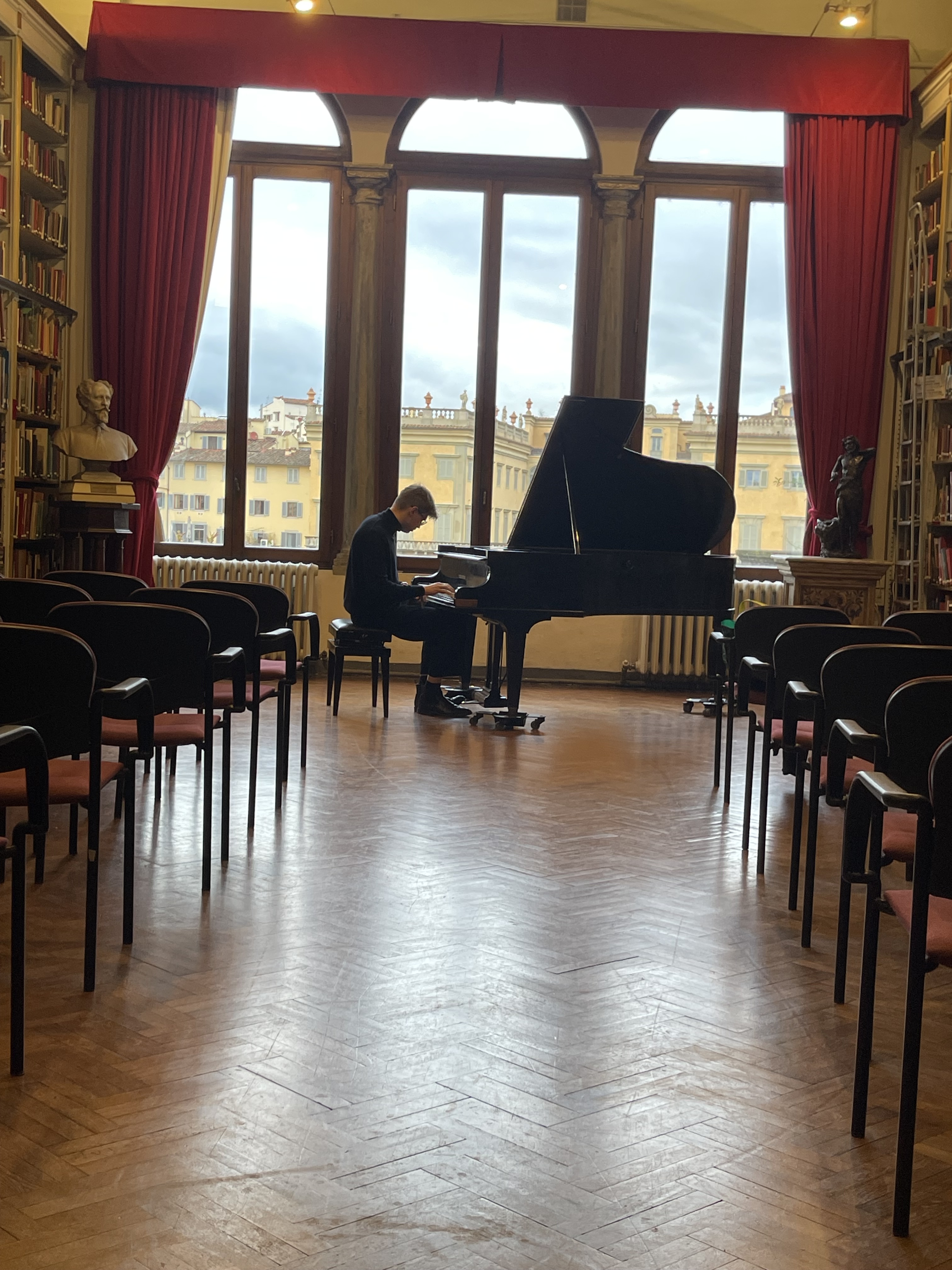 Tomos Boyles in a room with a view in Florence with an imposing programme that showed the musical pedigree of a first class honours graduate of Christ Church Oxford . Now perfecting his pianistic skills at the Royal Academy, that have just been recognised with a prestigious award from the Kirckman concert society in London. Playing that has been praised for its romantic flair and passion.