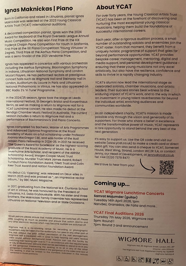 Ignas Maknickas returns to London after five years at the Royal Academy where his talent was allowed to grow and blossom . There is something very special about the Lithuanian school of playing with its great fluidity and natural beauty that was exemplified by Ignas today .
