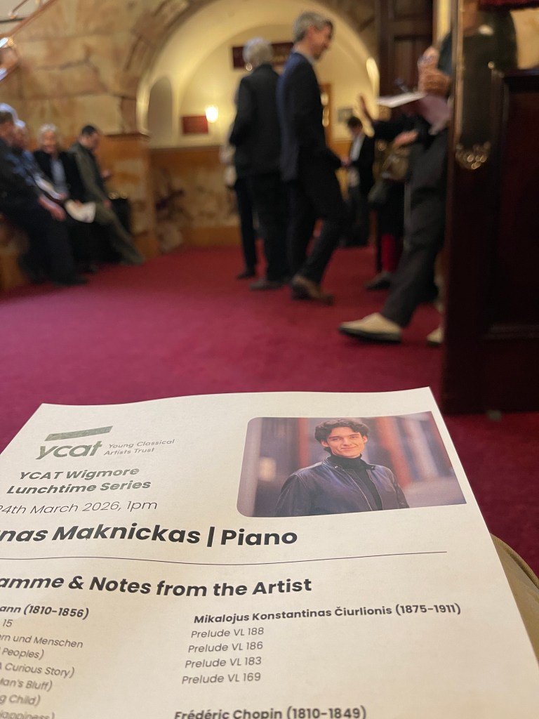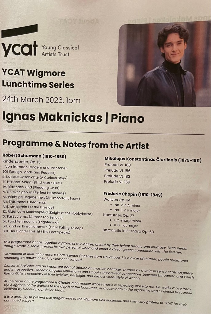 Many of these works that he played today I have heard him play before but with playing of such poetic creativity each work is like hearing it for the first time. ‘Kindersenen’ was full of magic sounds from t’he people of foreign lands’ to the ‘pleading child ‘ of disarming simplicity. What ‘joie de vivre’ on the ‘Hobbyhorse’ that he played with a charm that warmed the heart as did the ravishing beauty of the ‘child falling asleep’. A ‘poet speaking’ with such serious eloquence but then on a cloud of pedalled sounds reappearing with a heartrending coda. Four Preludes by a fellow Lithuanian Mikalojus Konstantinas Čiurlionis ( oh for the Wangs or Wongs !) which was a mellifluous outpouring of simple folk melodies of popular appeal not deep and searching but beautiful dreams in a sound world that was very much that of Ignas. Even the works of Chopin he had excluded the showpiece of op 34 n.1 opting for the disarming beauty of n. 2 which he combined with Chopin’s Cat who today was obviously on some sort of high! The two Nocturnes op 27 are two of Chopin’s most radiant and beautiful. The first in C sharp minor is a miniature tone poem where clouds accumulate and a storm is brewing but like a ‘Ship on the ocean’ it is is short lived and the thankfulness for it being over was one of those moments of magic that Ignas played with knowing beauty. The whispered beauty of the D flat nocturne showed Ignas’s mastery of balance where the melody line was not played with chiselled beauty but was revealed with its soul in tact as the magical changing harmonies were like whispers following the melody in the dark.