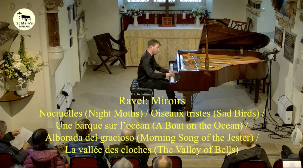 The highlight of the recital was a quite ravishing performance of Debussy’s Images book 2 . We held our breath as Tomos revealed the secret sounds in this 1890 Bechstein that have lain hidden for too long .There was magic in the air as sounds of extraordinary poetic imagination were recreated with Debussy’s bells gradually revealed, as they grew in intensity with ravishing glowing beauty, in a mist of radiance and subtle colouring .