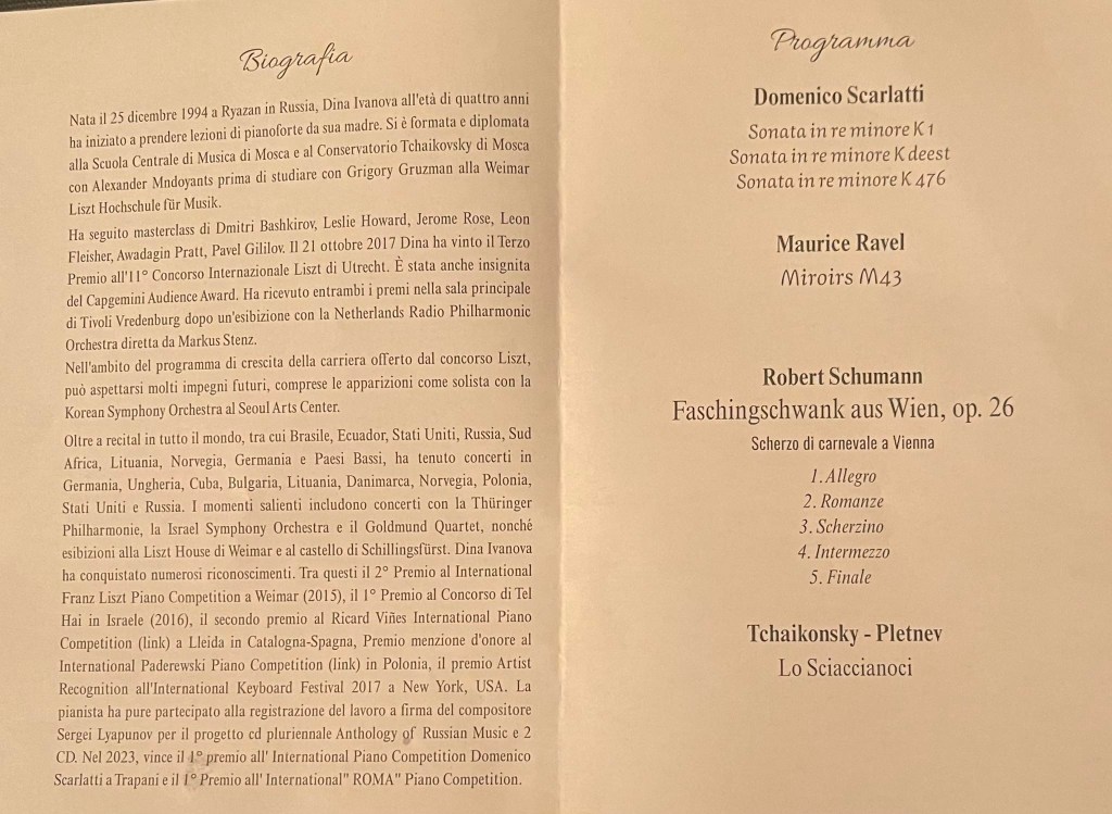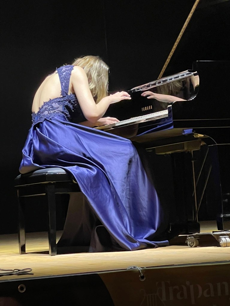 Dina even closed her recital after a breathtaking visit to Tchaikovsky’s ‘Nutcracker’ as seen through the eyes of Mikhail Pletnev, with a scintillating sonata ,K1, by Scarlatti where the ornaments glistened like jewels in the crown of Trapani. Playing of refined elegance with a palette of colours rivalled only by the crystal blue waters that glisten and glow as they gently lap the shores of this paradise.