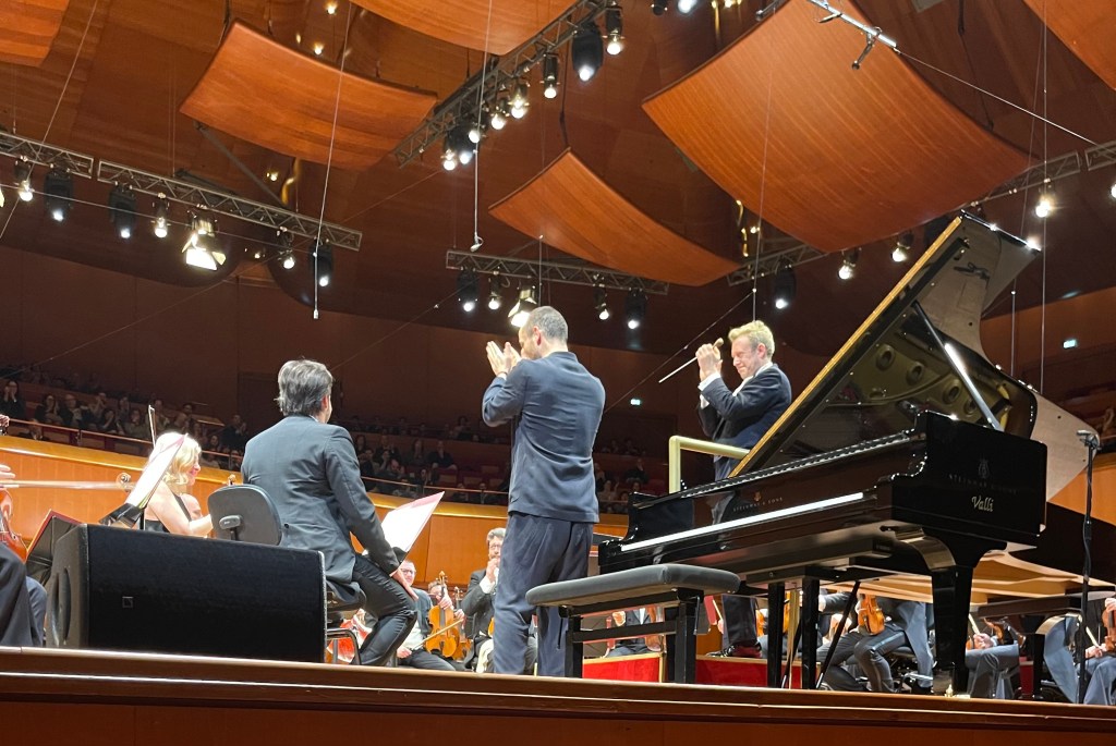 Igor Levit showing us that Brahms First concerto may be a duel between piano and orchestra but proving today with refined whispered playing that duels can also be won with gentle persuasion where beauty and radiance can defeat brute force and violence.