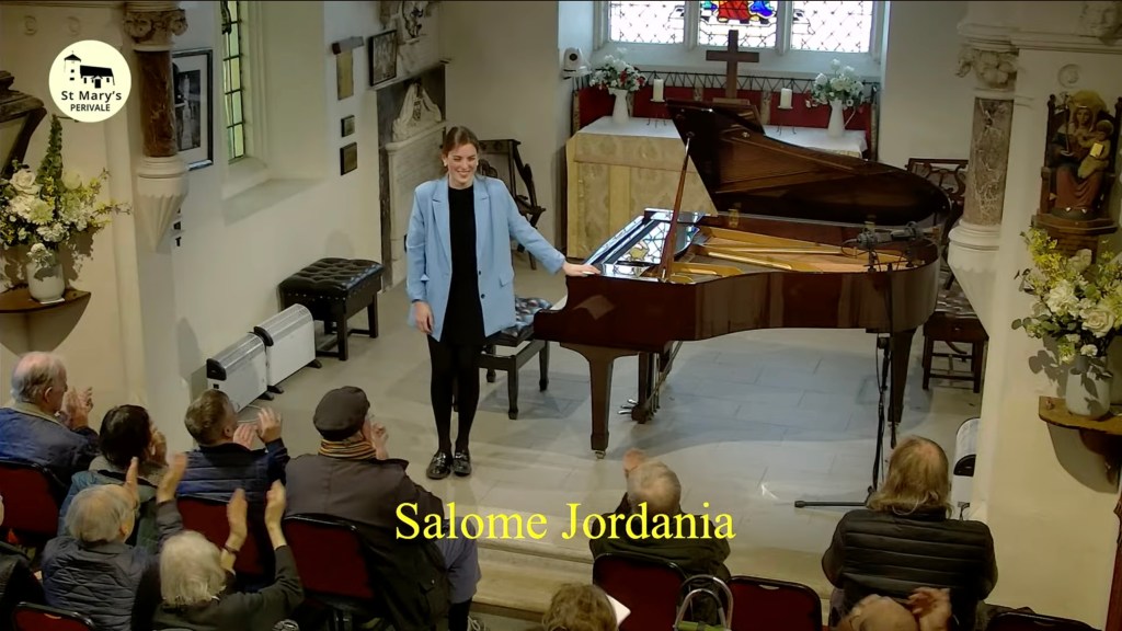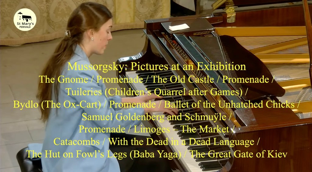 Pictures is so often given performances forgetting that it was written for the piano in mind, where a sense of balance and range of sounds is fundamental in disguising the fact that the piano is a percussion instrument. In the right hands and with a sensitive sense of balance and touch it can be made to sing and talk as expressively as the human voice. It was this that came across in Salome’s beautiful performance, where her musicianship and innate musicality allowed her to find colours and sounds of unusual expressiveness. Never resorting to brute force but searching for colour. Nowhere was this more evident than in Baba Yaga ,the penultimate picture, that was played with dynamic drive but with quite restrained volume which allowed for more contrasting sounds and where volume was substituted for intensity and sense of line. She had started her visit to the Victor Hartman Exhibition that had inspired Mussorgsky to write in only three weeks, this work dedicated to his friend who had prematurely died, with a promenade of simplicity but imbued with nobility. Leading into the diabolical antics of the ‘Gnome’ that she immediately played with rhythmic bite and great character, alternated with languid yearning ,and ending with a ‘Gnome’ that became almost too hot to handle as it exploded into a flash of brilliantly played notes. A lazy stroll to the next picture of the ‘Old Castle’ played in a nostalgic atmosphere with a beautiful duet between the hands as it disappeared into the mist. A rumbustious promenade moving on now to the next picture of children squabbling in the ‘Tuileries’, played with great spirit and lightweight vitality. The lumbering ‘Bydlo’ appeared on the scene with great resonance, beautifully contrasted with the central episode before it lumbered its way into the distance, it was here that Salome’s control of sound produced some quite masterly effects. An etherial walk to the glowing brilliance of the ‘Chicks’ with playing of rhythmic vitality, the clucking trills thrown off with fearless brilliance but also beautifully shaped.. ‘Goldberg’ entered with his austere authority played with great clarity as was the simple reply of Schmyle. ‘Goldberg’ now in the bass with a beautifully shaped melodic line before the subdued interruption of the simple Promenade. Salome brought a scintillating brilliance to ‘Limoges Market’. with playing of masterly brilliance where she brought an unusual clarity to the driving climax that was so rudely interrupted by the noble vision of the ‘Catacombs’. These were played without any exaggeration but with simple resonance and beautifully conceived reverence. ‘Baba Yaga’ burst onto the scene without the usual brutal force but with a musical intensity that was even more compelling. It was the same with the vision of the ‘Great Gate of Kiev’, where Salome’s sense of balance and palette of sounds combined with her great musicality to astonish and amaze us with the colours and glowing brilliance with which Mussorgsky could describe such a noble edifice. A remarkable performance not for its brute force but for her masterly playing of control and musicianship that could bring such character and style to a well worn showpiece so often brutalised in lesser hands.