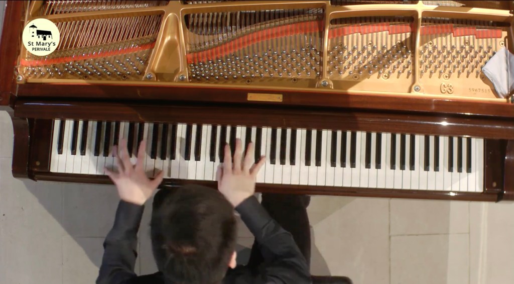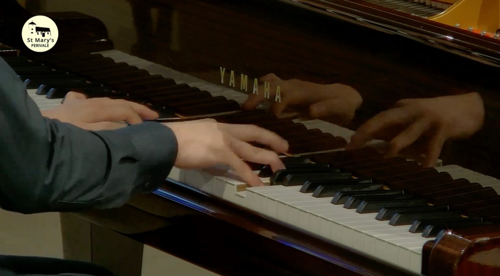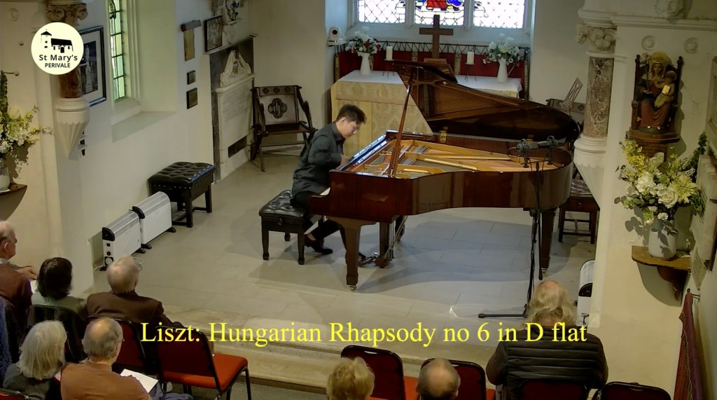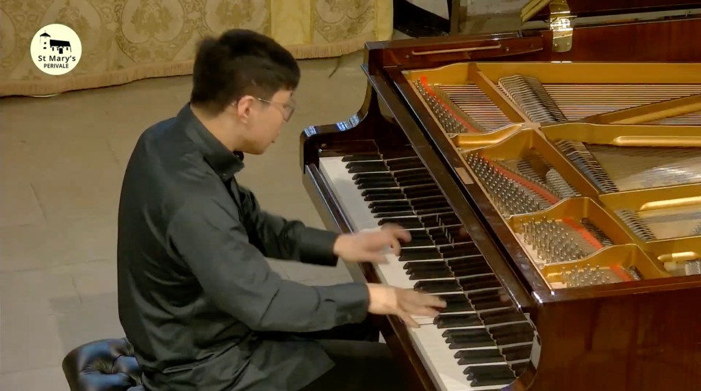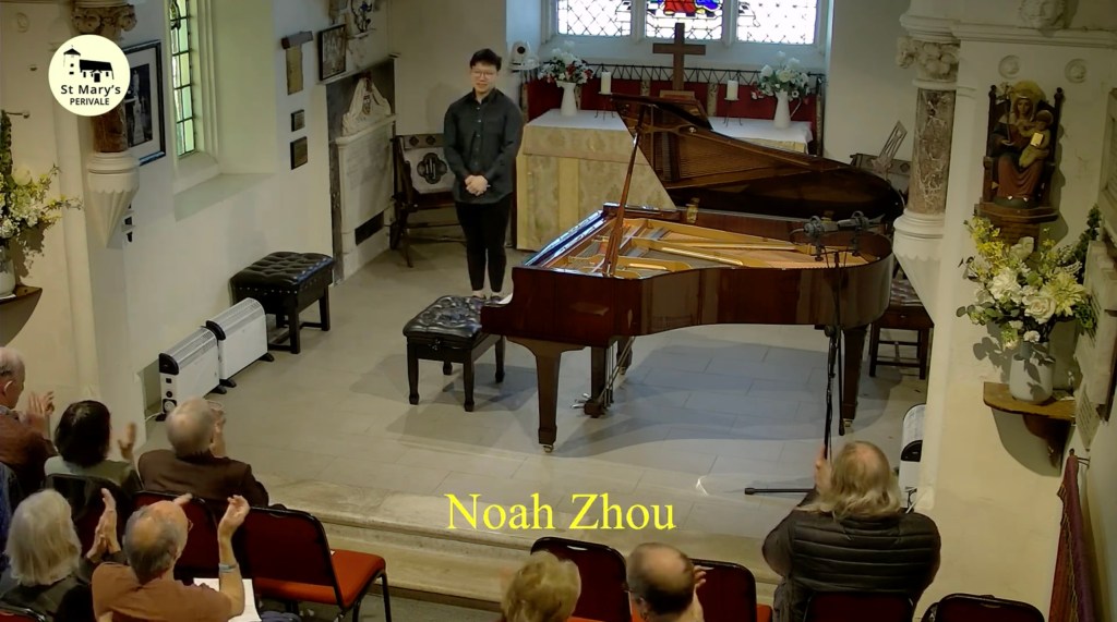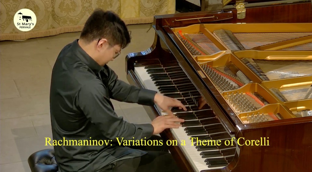 Noah played all twenty variations today with poetic beauty and scintillating brilliance.There was no coughing in Perivale and Noah could allow us to hear his first outing of this work with playing of great precision and rhythmic drive. Immediately emerging himself into the brooding character of the ‘Minuet’ third variation, before the beautifully sung fourth , with its etherial comments played with simple knowing ease by Noah. A dynamic drive to the fifth lead straight into the intricate knotty twine of the sixth and the majestic explosion of sounds, on the pedal note of D, in the seventh .The eighth was even more agitated and played with a Rachmaninovian sumptuous brilliance ending with cascades of notes sweeping across the keys. Capricious meanderings of the ‘Adagio misterioso’ and the radiant harmonies of the ninth were played with languid beauty spread over the entire keyboard. A pulsating rhythmic energy to the tenth with typical vituosistic Rachmaninovian embellishments of transcendental difficulty bringing savage rhythmic drive to the eleventh. A pulsating syncopated rhythmic energy to the twelfth before the chords of the thirteenth played with sumptuous full sounds by Noah . The improvised ‘Intermezzo’ was played with a ravishing palette of colour and masterly use of the pedal as it dissolved into ‘La Folia’ now in the major key of D flat. Noah played it with glowing simplicity as it unwound into the fifteenth with pastoral simplicity.Taking wing again with the sixteenth and swirls of notes leading into the calm of the seventeenth where the theme was floated on a gently moving bass. The last three variations were a ‘tour de force’ of dynamic drive and brilliance with Noah throwing himself into the fray with fearless abandon until arriving on the repeated bass ‘D”s as the theme was allowed to float magically on this wave of whispered beauty. A remarkable first outing for Noah of a work of transcendental difficulty where he can already steer us through such knotty twine with intelligence and poetic understanding.