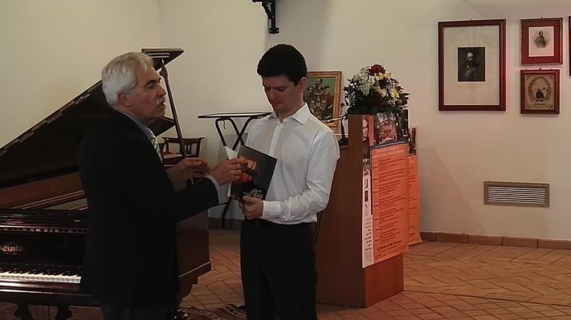 Ivan Donchev receiving a book from the hands of Maestro Tammaro about Villa Mondragone