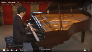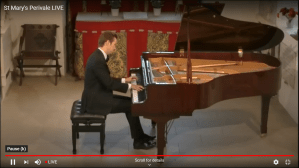 I have known Petr for some time being in a select group of musicians that include many old friends like Alexander Ullman,Sasha Grynyuk and Evelyne Beresovsky.All remarkable young musicians on the threshhold of important careers.But I have never heard Petr give a solo recital.Today at St Mary’s was just that opportunity in the final concertof the lockdown series that has included over 70 concerts streamed live or from the archive when live streaming was not permitted at the height of the Covid crisis.As Dr Mather rightly said at the end of Petr’s masterly recital it was a fitting end to a very difficult period for young musicians’ survival without public concerts.In fact St Mary’s is one of the very few realities that have insisted on playing to an empty hall,streamed live, thus offering nevertheless a professional engagement to help so many struggling young musicians at the start of their career.