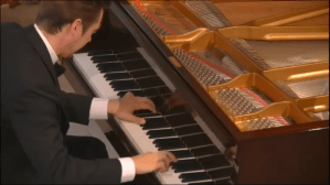 From the opening Gnomus played with an almost ghostly ‘spooks in the night’ feel.To the Old Castle shaped with a great sense of balance that allowed the left hand heart beat to throb so delicately under the luminous nostalgic melodic line .Tuileries was played with gentle insistence leading to the ponderous grandure of Bydlo that gradually disappears into the distance with a very telling ritardando that was Petr’s personal addition,I believe, but that worked so well here.The Ballet of the Unhatched Chicks chattered on to its very cheeky ending.Before being interrupted by a very noble Samuel Goldenberg and Schmuyle with an impressive build up of repeated notes and a very moving ending.All the bustle of Limoges market was played with impressive technical control and excitement leading to the rude interruption of Catacombae with its impressive dissonant chords that make the resolution Cum mortuis even more magical in Petr’s sensitive hands especially when played with his almost pleading poignancy.Baba -Yaga was full of animal excitement and great feats of virtuosity .The middle interlude seemed almost orchestral with the question and answer between the hands whilst the murmur of the orchestra in the middle part of the keyboard was ever present and undisturbed, as if by magic!The Great Gate of Kiev was played with masterly control of colour and timbre with the great bells sounding in every part of the keyboard.A very impressive sense of balance and insistence on the pivotal bass notes gave great weight with a sumptuous full sound that brought this performance and the season to a marvellous end.