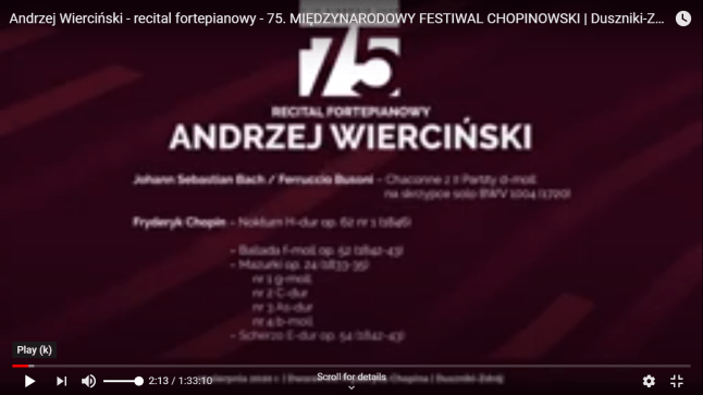 It was last April that I was able to hear Andrzej Wiercinski in the young pianist’s Mecca of St Mary’s Perivale in London.It gave me great pleasure to read my impressions before listening to the recital streamed from the remarkable 75th Duszniki International Chopin Festival in Poland .I had heard Federico Colli and Dmitri Alexeev both give superb performances- by coincidence on their birthdays.Arcadi Volodos’s concert that I was so looking forward to hearing again after Rome last february was not streamed.(I have included my impressions below from his performance in Rome last February)