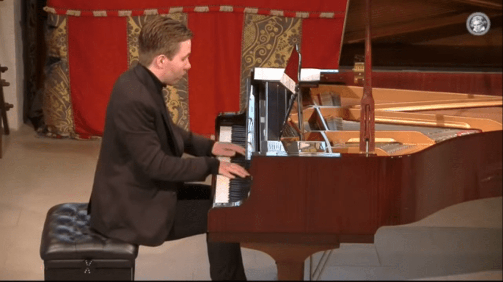 It was just this sense of character that was so much part of Thomas’s interpretation.As Thomas himself says:’The opening scales are like a call to attention, which is followed by a D flat major episode hinting at the sublime.’In fact it was just this difference between the scale interruptions that obviously gave the improviser time to decide what direction he would take next.It is nice to think of Beethoven seated at the piano changing from one mood to another.From the hauntingly beautiful first episode played with a beauty of sound and a feeling that the music was being created in that very minute.This infact is one of the first things I noted about Thomas’s playing .The spontaneity and obvious delight at finding the most ravishing tonal varieties due to his very natural technical agility allied to a very sensitive ear.There followed a cordial B flat major theme, a vicious passage of broken octaves played with a wonderful rhythmic impetus and forward drive. Impatient somewhat violent interruptions – obviously Beethoven having fun at the keyboard.The main theme in an unexpected B major has overtones of the choral themes in the Fantasy op 80 and 9th Symphony, on which Beethoven proceeds to write a set of his best variations.The final delicate collision of scales brings the work to a peaceful conclusion.A fascinating journey and a thanks to Thomas and the BPSE for including this rarely heard work in this 250th anniversary year