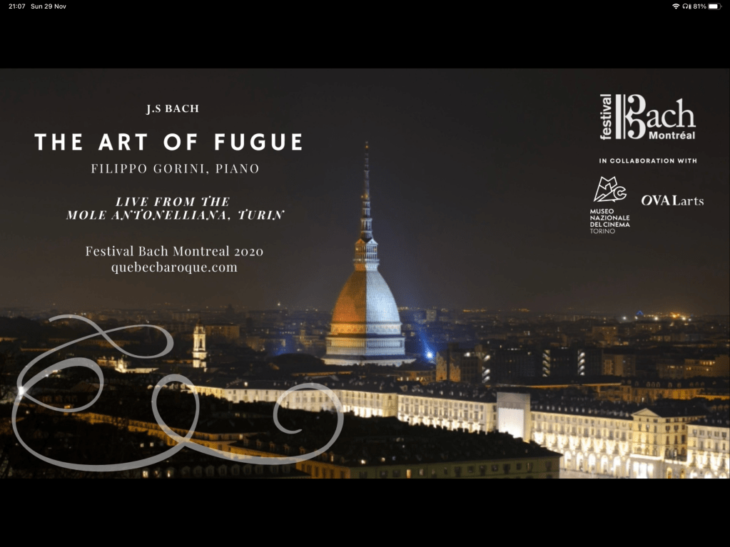 The Art of Fugue.Two hours of Bach’s mathematical genius revealed in an extraordinary performance by Filippo Gorini streamed live from the Molle Antoniana in Turin the tallest museum in the world.It is a major landmark in Turin and takes its name from its architect,Alessandro Antonelli.Construction began in 1863 and was completed in 1889, after the architect’s death and it was originally conceived of as a synagogue but it now houses the National Museum of Cinema.