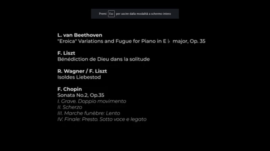 J.S.Bach Partita n.2 BWV 826 Sinfonia-Allemande-Courante-Sarabande-Rondeaux-Capriccio- B .Bersa Venetian Barcarolle op 58-Schubert/Liszt Der Muller und der Bach S 565-F.Liszt Ave Maria S 173/2 from Harmonies Poétiques e Religieuses- F.Liszt La lugubre gondola S.200/1-F.Liszt Miserere d’après Palestrina S.173/8- F.Liszt Variations on a theme of Bach Weinen,Klagen,Sorgen,Zagen S.180 and encores of Chopin Prelude op 28 n.13,Schumann Arabesque op 18 Bach/Busoni Ich ruf zu dir