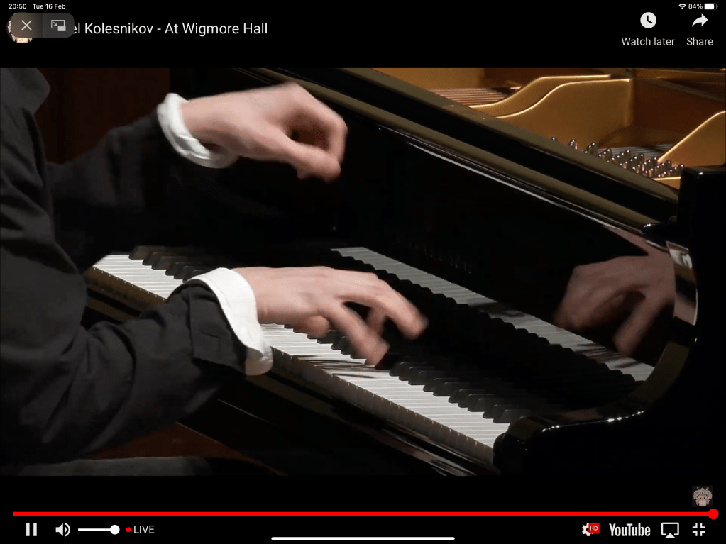 ’Une barque sur l’océan’was a truly remarkable performance where the difficult cross rhythms were thrown of with a subtle ease and the sudden storms that cross the path were allowed to interrupt the flow with great technical brilliance.Here his crystalline sounds really added to the extraordinary sound picture that Ravel describes.The almost religious appearance of the left hand chorale over shimmering right hand sounds would have been even more sublime if he had allowed Ravel to speak without any rallentando,however discreet.Ravel was a master of clarity – the precision of a clock indeed-that no underlining is necessary.But it was nevertheless an almost perfect performance and I do not remember ever hearing an ending so clear and yet so magical and doubt I will again.