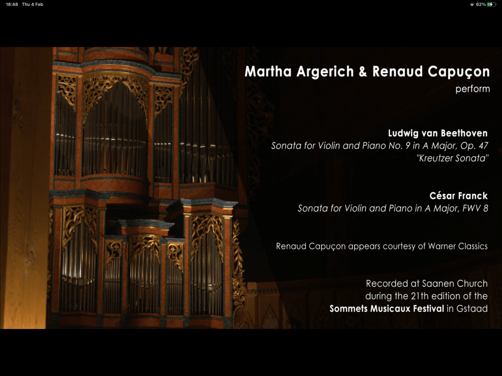 Pure gold Renaud Capucon with Martha Argerich from Gstaadt with the Kreutzer and Franck Sonatas streamed live but watchable as a guest on Medici web site .Tomorrow Martha Argerich with Nelson Goerner and Sunday Capucon in trio with Kantorow.