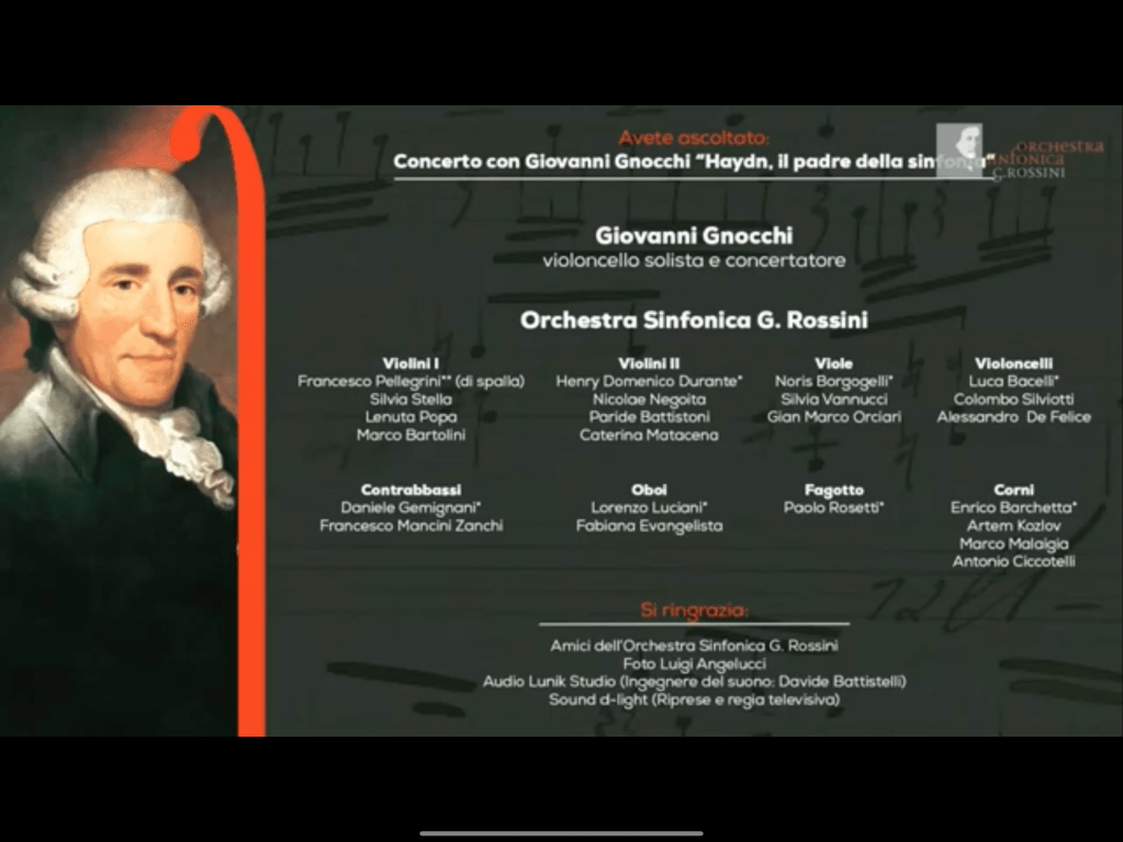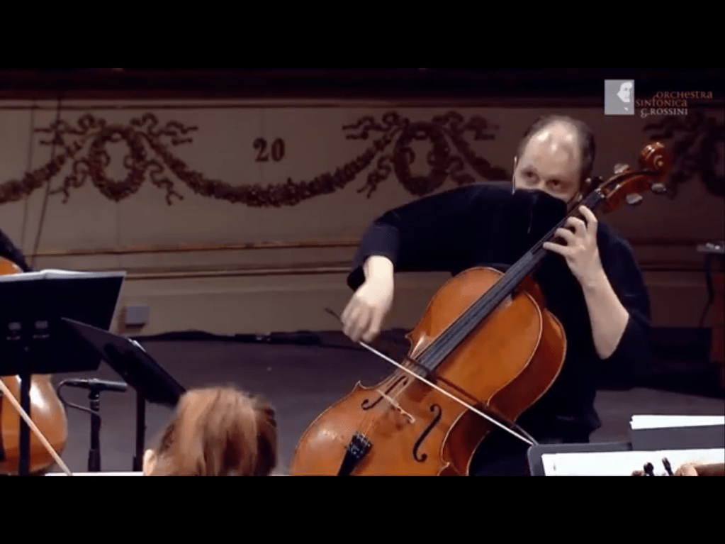 Some superb performances from these masked performers conducted from the cello by Giovanni Gnocchi.In the beautiful Teatro Rossini in Pesaro he led his very fine players in Haydn’s first cello concerto and also still with his beautiful steed in hand,conducted Haydn’s 39th Symphony.