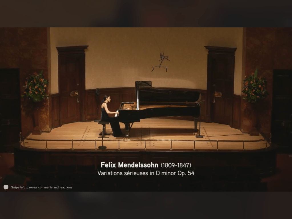 - Variations sérieuses in D minor Op. 54.The beauty of the Andante sostenuto theme was played with such subtle colouring and led to the first variation where her legato in the right hand was matched by the gentle staccato of the left.The continual flow of the second led us to the drama of the third and the fleeting jeux perlé that followed.Building up the tension with the agitato fifth and the almost playful sixth before the virtuosity and excitement of the seventh and eighth.The beautiful change of mood with the warmth and sublime calm before the tempest was magically controlled with quite exquisite sounds.The beautiful tenor melody was accompanied by the butterfly staccato cascades of delicate notes so similar to Schumann op 13 studies.There was deep meditation too in the following two variations :Adagio and gradually poco a poco più agitato.The tumultuous final two variations were played not only with brilliance but with such colour and architectural shape that was breathtaking in its audacity and at times even delicacy before coming to rest on the last three magical chords.