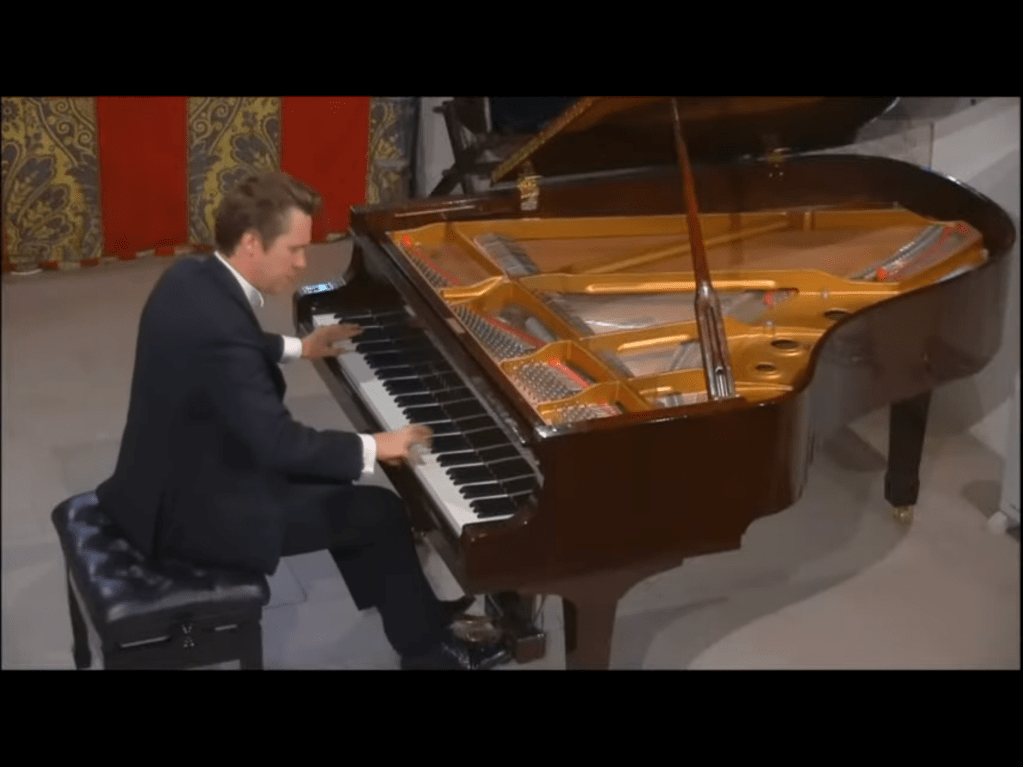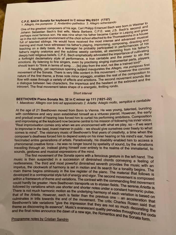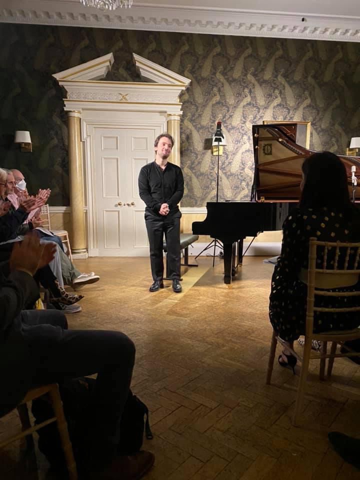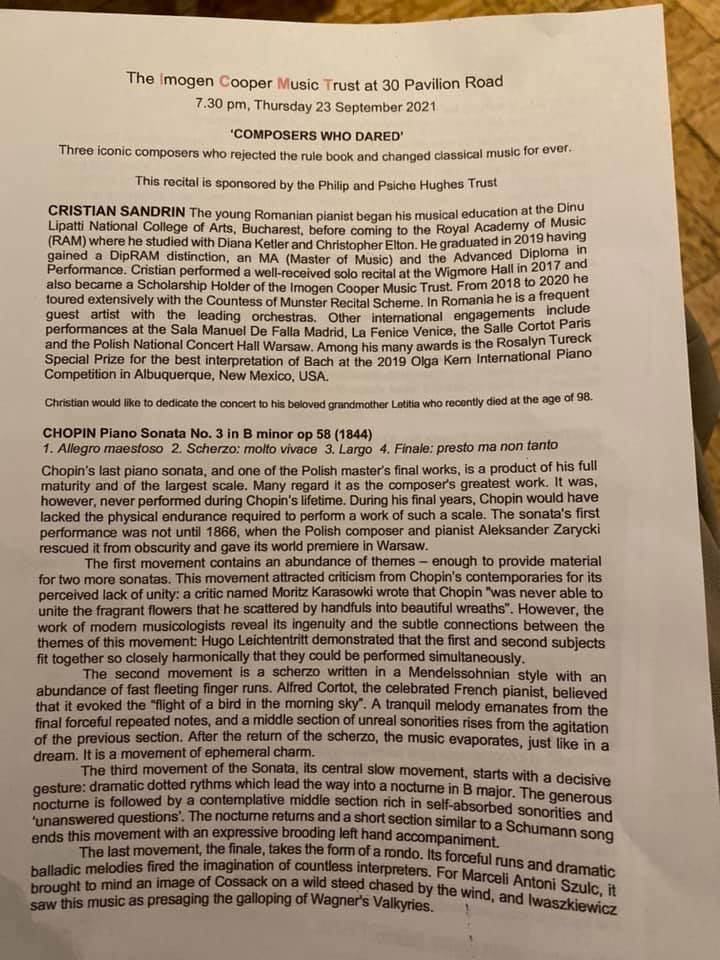 Here are a few thought that I jotted down :’Someone who loves the piano and listens to himself.A master of ravishing playing who illuminated the Fazioli Grand Piano with sumptuous refined sounds.Masterly performances that held us spellbound .Chopin’s fourth Ballade restored to the pinnacle of the romantic repertoire -a truly ravishing Barcarole and a second Ballade that had us on the edge of our seats.’His encore of his own improvisation just showed what a unique artist he has become.All best wishes at the competition in Warsaw.