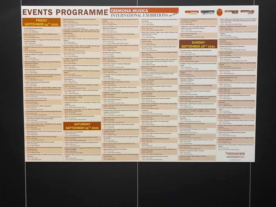 It was wonderful to be back in Cremona after only the on-line edition last year due to the pandemic.Just to look at the programme and see the hundreds of people eager to partecipate whether constructing instruments or playing them was a signal that all was well with the world.It is right that the signal should come from Cremona the city of music where even the streets are named after the violin craftsmen that have given such lustre to this beautiful city.