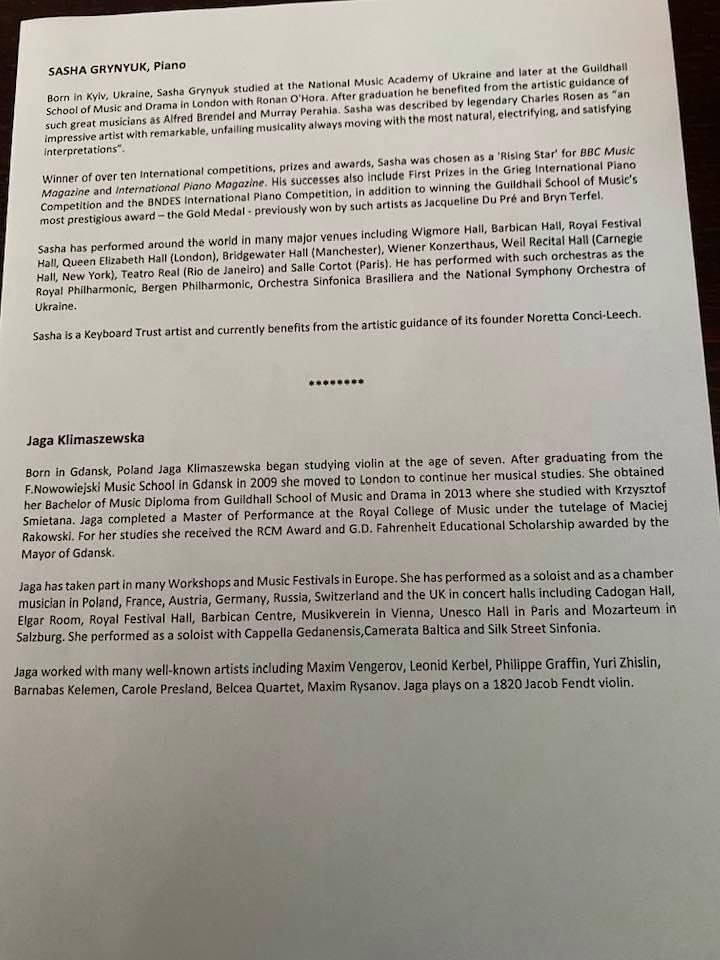 From the whispered urgency of the Molto Allegro and the deeply expressive contrapuntal Andante.Complimented by a rather militaristic Menuetto (that I found a little on the fast side ) with a Trio that had to be slowed down quite considerably.It did though give great contrast with the burning intensity of the Allegro assai Finale.Some very fine playing from this ensemble who applauded Sieva Borzak at the end for taking them into a realm of magnificent music making together.