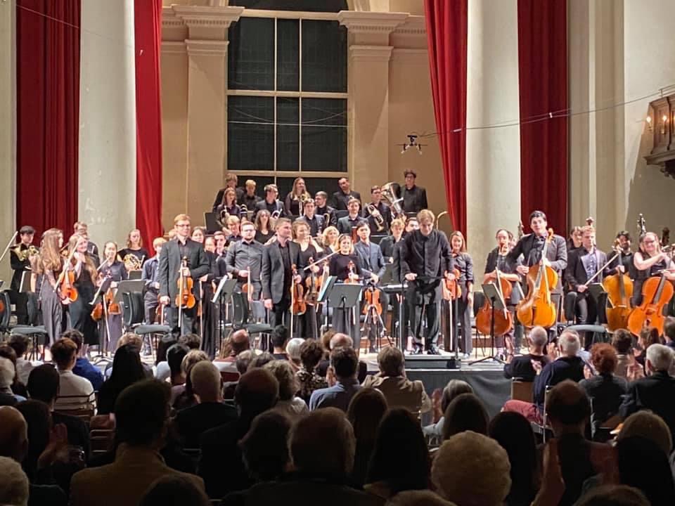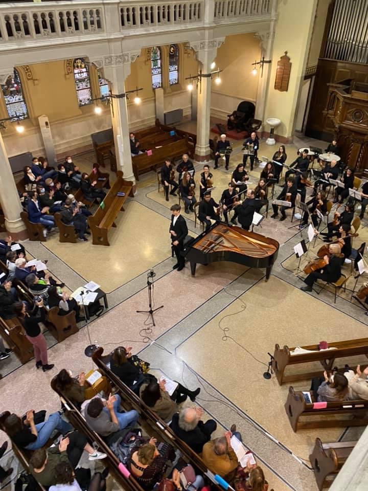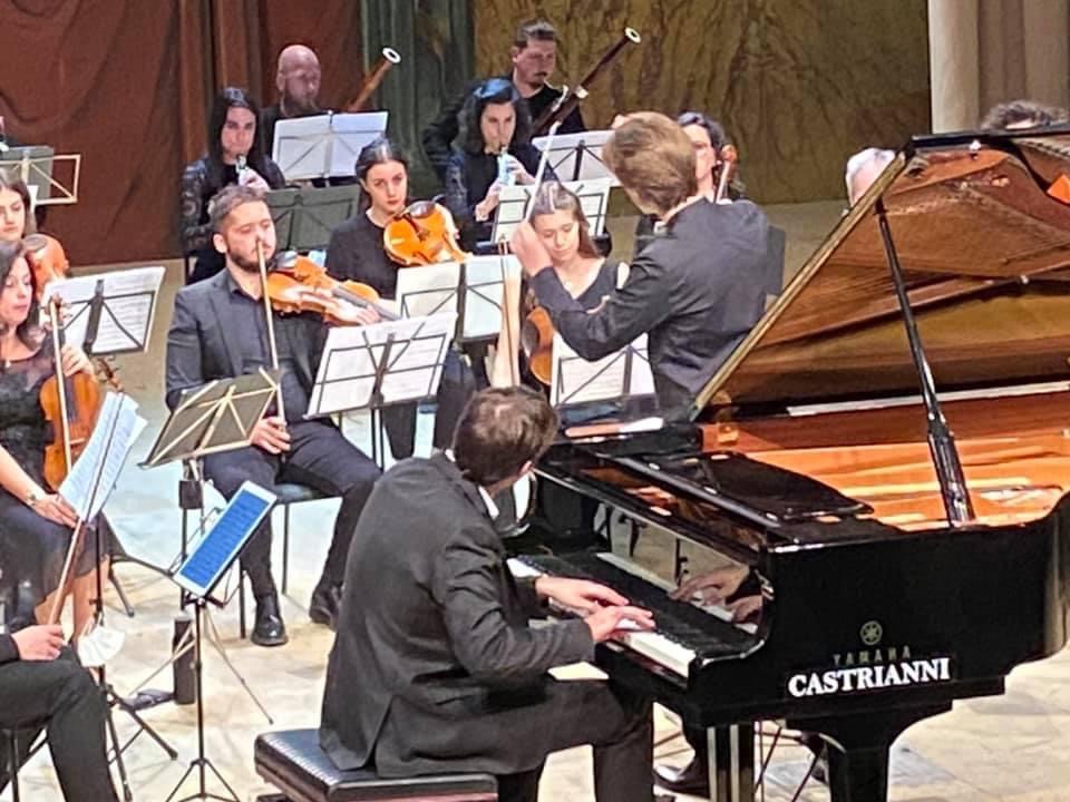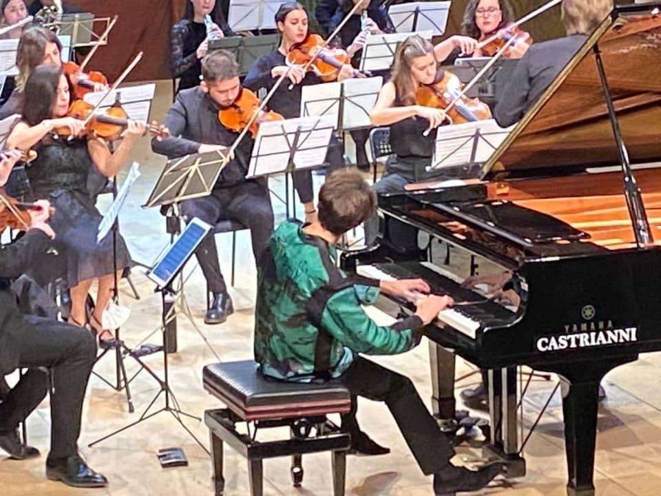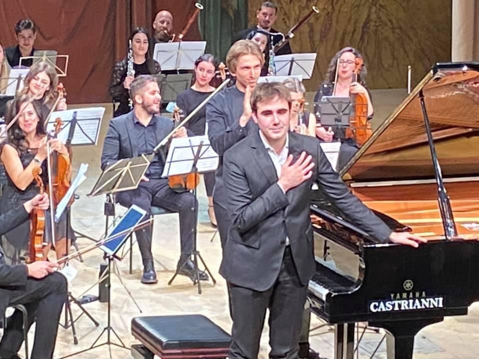Pietro Fresa on the other hand in a much more sombre dark suit as befitted the dark and subtle beauty of the B flat Concerto.The sublime opening barely a whisper from an orchestra where exhilaration and rhythmic excitement had been transformed into a serene meditative atmosphere.And Mozart’s sense of energy of almost operatic proportions was played with great precision and contrasts by an orchestra following so attentively the ‘Giulinian’ shaping from Sieva’s expressive hands.The scene was set for the mellow simplicity of Pietro Fresa’s opening statement.Played with a purity of sound almost chiselled as it penetrated to the very back of the hall with extraordinary clarity.Injecting the delicate passage work with the romantic fervour of a young man on a voyage of discovery.Some very personal touches gave great character to the continual dialogue with the orchestra.The gradual build up in the development section was beautifully integrated into the orchestra and led to a sublime outpouring of melodic invention before the gradual return to the recapitulation.The precision of his articulation was remarkable in its clarity and shape and led to Mozart’s own cadenza that was played with great style.It brought the same question and answer that we had heard earlier with the orchestra but now alone played with even more delicacy and character.