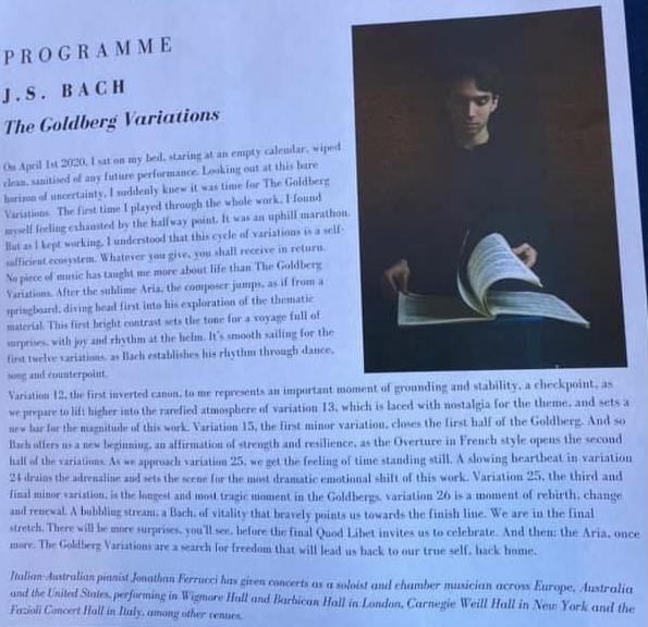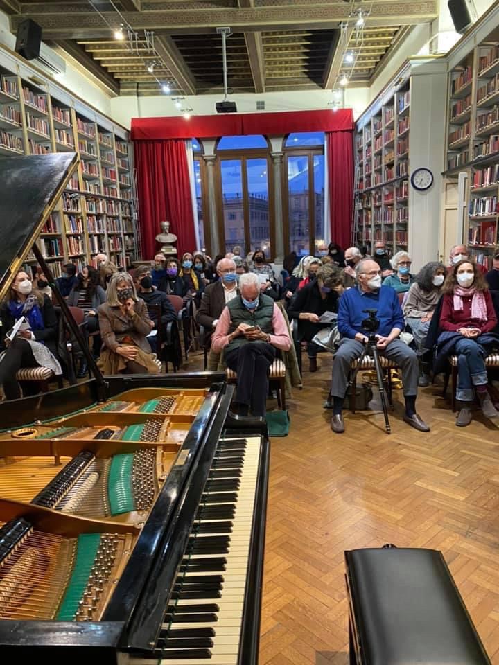 As Valerio Vicari explains in the programme of ‘La musica è una cosa meravigliosa’ each of the four concerts is enriched by an expert introduction that describes the world of the composer,the sense of the works in the programme and their part in the evolution of music.Well Guido not only did all that but he also amused and enlightened us with letters of the time describing the reaction that the works had produced. Jonathan had opened this important season at Torlonia with a performance of the Goldberg Variations introduced by another celebrated musicologist Sandro Cappelletti.He went on to repeat that performance again ,at the beginning of the week,in the same collaboration with the KCT in Florence in the Harold Acton Library. https://christopheraxworthymusiccommentary.wordpress.com/2021/10/27/jonathan-ferrucci-the-return-of-a-warrior-the-goldberg-variations-in-florence/