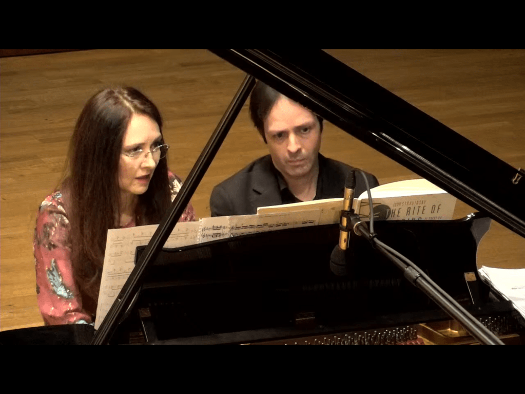 A duo that plays as one as was evident from their performances of Stravinsky ,Rieti and Respighi. A clarity and rhythmic precision that gave such architectural shape to Stravinsky’s original version of the Rite of Spring.From the subtle beauty of the opening to the insinuating harmonies and rhythms that takes us to the great baccanale that caused such a scandal at its first performance in Paris under Pierre Monteux.The Rite of Spring is a ballet and orchestral concert work written for the 1913 Paris season of Diaghilev’s Ballets Russes company; the original choreography was by Nijinsky.When first performed at the Théatre des Champs-Elysées In Paris on 29 May 1913 the music and choreography caused a sensation’ Stravinsky’s score contains many novel features for its time, including experiments in tonality,metre,rhythm,stress and dissonance and is regarded as among the first modernist works.The music influenced many of the 20th-century’s leading composers and is one of the most recorded works in the classical repertoire.