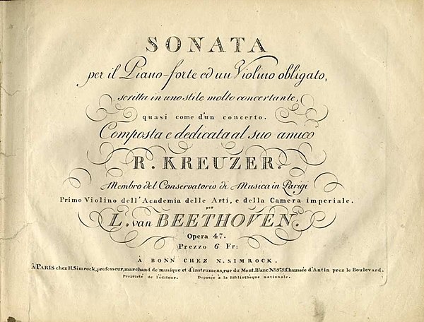 In the composer’s 1803 sketchbook, the work was titled “Sonata per il Pianoforte ed uno violino obligato in uno stile molto concertante come d’un concerto”After its successful premiere in 1803, the work was published in 1805 as Beethoven’s Op. 47, with its re-dedication to Rudolphe Kreutzer, which gave the composition its nickname. Kreutzer never performed the work, considering it “outrageously unintelligible”. He did not particularly care for any of Beethoven’s music, and they only ever met once, briefly.