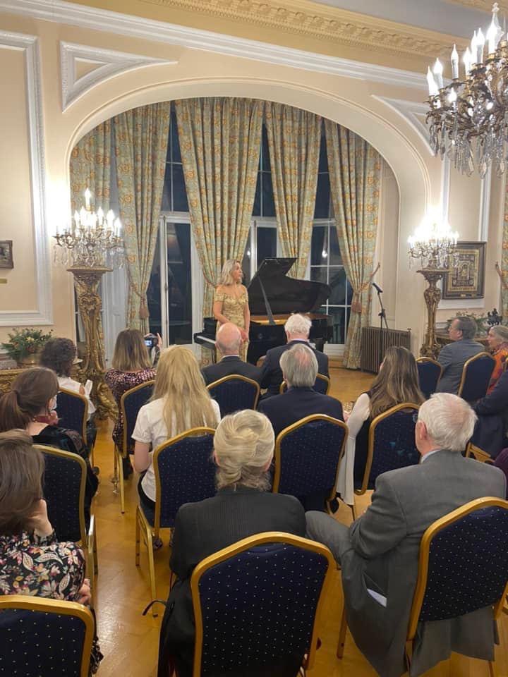 It was such a surprise to receive two invitations to hear concerts by friends both on the same day and almost the same time.I was delighted to be able to listen to Yulia Chaplina first but had no idea that it would be in such a sumptuous setting.It must be in just a setting that the young Chopin had his overwhelming success in the salons of the aristocracy in Paris.Yulia appearing in an evening gown from a couturier collection played to a select group of guests celebrating the work of the Hermitage Foundation UK .A short speech by the chairman James Dawnay immediately made one aware of the valuable work that they are doing in forging cultural exchanges between our two great nations.