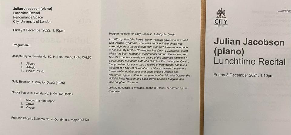 Julian had asked her for a piece to play in today’s concert and it was ‘Lullaby for Owain’written in 1986 that he played today.It was inspired by the uncertain emotions that a parent might feel at the birth of a child with Down’s Syndrome.The initial shock mixed with powerful love and pride.It was a very simple peace almost pastoral in atmosphere and played with clarity and rhythmic precision.A modern vocabulary that spoke every bit as powerfully as the Great E flat Sonata Hob.XV1:52 by Haydn that had preceded it.