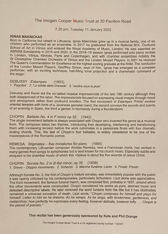 Ignas Maknickas presented by the ever generous Dame Imogen Cooper in the sumptuous surrounds of Pavilion Road in Knightsbridge.Playing of such fluidity and radiant sounds with a natural technical brilliance that brought vividly to life all he played.It was though his fellow Lithuanian Alvidas Remesa that ignited his imagination and allowed his kaleidoscopic sense of sound to convey the extraordinarily evocative sound world of this Franciscan Monk