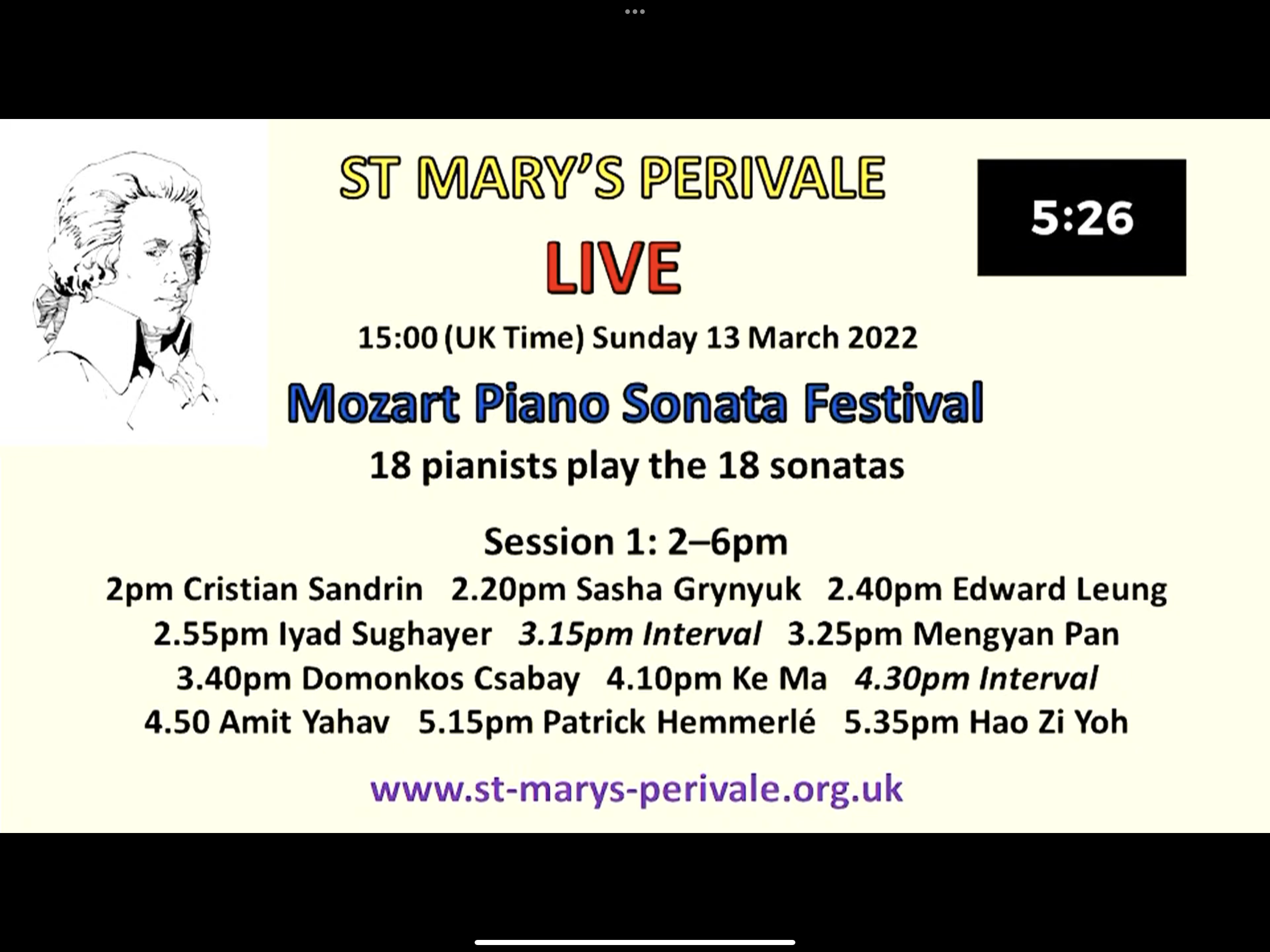 It was interesting to note the style and simplicity that all the pianists showed today.It was Schnabel who famously said that Mozart is too easy for children but too difficult for adults.His teacher Theodor Leschetizky told him:’You will never be a pianist;you are a musician’. Schnabel later boasted that:’he would only play music which is better than it could be performed!’While on a tour of Spain,he wrote to his wife saying that during a performance of Beethoven’s Diabelli Variations he had begun to feel sorry for the audience. “I am the only person here who is enjoying this, and I get the money; they pay and have to suffer.”All this to say that Mozart requires the knowledge of style but also a superlative technique to be able to interpret this genial music with clarity and precision but also a subtle sense of character and colour so similar to the purity of Mozart’s world of opera.It was strange -maybe even refreshing – that there was very little added ornamentation which has become the norm these days.Scholars such as Robert Levin have indicated that ornamentation and improvisation would have been an essential part of a musicians baggage in the nineteenth century.I noticed only Amit Yahav and Pavis Hajazi added some very discreet ornamentation.We live in an age when it is difficult to hear a performance of a Mozart or even Beethoven concerto without some ornaments filling out certain passages as were the performing practice of the day and so I found it refreshing to hear Mozart’s bare outline etched with such purity and clarity by all the pianists.The ornamentation kept much to what is the bare outline in the score (I pricked up my ears only at the opening of K.310! which I must ask Amit about one day).This is not the place to make a detailed analysis of each performance all of which were to admire above all for the fact that there was no I Pad to be seen from eighteen pianists who had risen to the challenge with great professionality.Each pianist presenting their allotted sonata with such character and personality.From the impish good humour or Cristian Sandrin in the very first sonata or the simplicity and velvet sound of Sasha Grynyuk.Both Cristian and Sasha look and sound as though they belong to the piano or the piano belongs to them – there is a strange alchemy that makes for a perfect match indeed.There was the great rhythmic drive and characterisation of Edward Leung and the sublime beauty of the Adagio opening of K 282 in the hands of that born Mozartian Iyad Sughayer.The crystalline sounds that Menyang Pan found in K .283 where her slow tempo for the Andante managed to seduce and convince as her superb musicianship always does.Domonkos Czabay showed us the serious Hungarian style of a musician I have admired for some time.Ke Ma was given bouquets of flowers from her charming little students for her superb performance of K 309 played with great intensity and commitment.After a welcome tea break Amit Yahav played the great A minor sonata with all the depth and weight of a serious thinking musician who had delved deep into this Sonata understanding only too well what the death of Mozart’s mother could mean to a sensitive artist.Patrick Hemmerlé amazed as always by his understanding, involvement and the just weight he gave to every scintillating note.Patrick could play at the drop of a hat the entire piano repertoire and has amazed us at St Mary’s for many a year.Hao Zi Yoh standing in at two days notice for a Covid victim amazed for the freshness and subtle sounds she produced especially in the sublime Andante cantabile .Above all the opening trills that unwound with enviable precision and musical meaning took my breath away.She above all exemplifies Mozart:simple,beautiful and fresh.