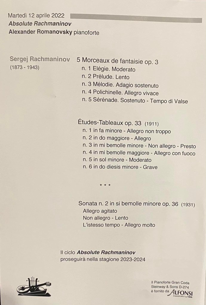 They say miracles never strike twice in the same place but in the Eternal city they do.After Sokolov’s six encores last night we were treated to eight from Alexander Romanovsky after his quite extraordinary recital in the first of his series of the complete works of Rachmaninov to celebrate the 150th anniversary of his birth.