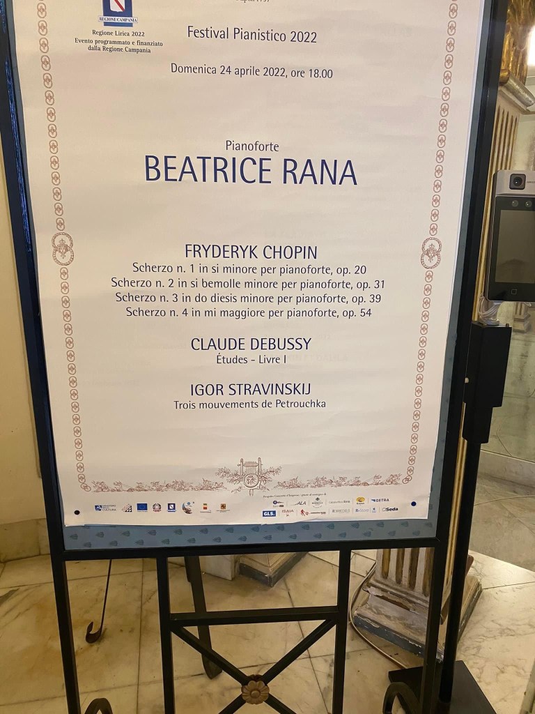 Wonderful to see Beatrice Rana on this vast stage of one of the most beautiful opera houses in the world – San Carlo in Naples.The third in a series of six piano recitals for this new venture of artistic director Stéphane Lissner :Festival Pianistico 2022.A festival that is alternating with the much awaited performances of Turandot with Jonas Kaufmann.