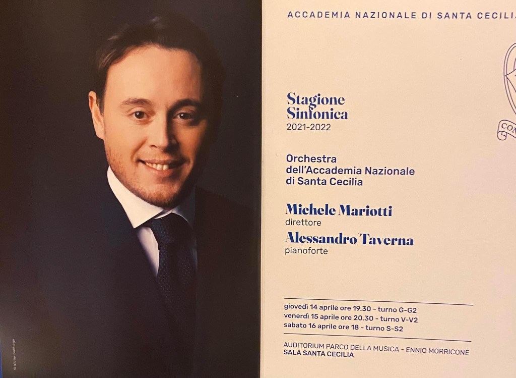 It is fitting that Alessandro Taverna started his professional career many years later in 2009 winning recognition in the Leeds Competition. Today he gave a superb performance to an audience sadly depleted for Easter in Rome. All those present,and I was glad to see it being recorded,were able to appreciate Alessandro’s crystal clear virtuosity on a magnificent Fazioli concert grand.It may have been a depleted audience but that did not stop their enthusiasm insisting on an encore.He gave a scintillating performance of Friedrich Gulda’s jazz piece Play piano Play.